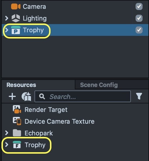 Once the glTF is imported into Lens Studio, you should see it listed in your Objects panel as a new object added to the scene. It will also appear in your Scene panel, where it can be manipulated. Finally, your model resource will now be available in the Resources panel as well.