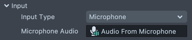 Set Input Type to Microphone, set Microphone Audio with the Audio From Microphone asset if it’s not set already.
