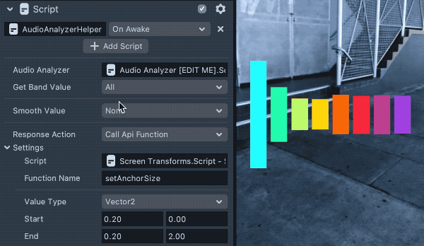 Template comes up with a universal AudioAnalyzerHelper script that allows it to perform certain responses to the change of band value.