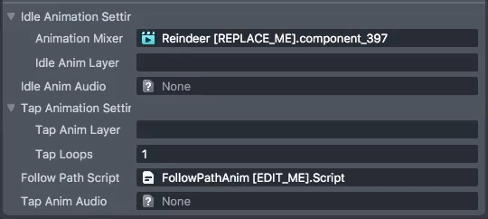 These layers can be used to define the additional animations that will play on interaction. For the Interactive Path Template we can use up to four animations to expand on the behavior of found in the Interactive Tap Template. First, set the Idle Anim Layer field to the layer name of your looping idle animation. Then, set the Tap Anim Layer field to the layer name of your tap animation which will play when the object is tapped.