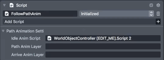 Idle Anim Script (ScriptComponent)- This value is a reference to the WorldObjectController SceneObject that contains an instance of IdleAnim.js and is recommended not to be adjusted unless necessaryPath Anim Layer (string)- The name of the animation clip or layer that the object will play when moving along the pathArrival Anim Layer (string)- The name of the animation clip or layer that the object will play when moving along the path