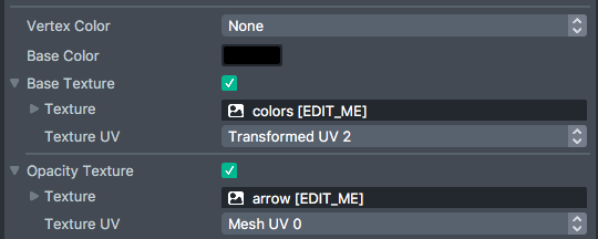 For the arrow_draw material the Base Texture will scroll along the "up" direction of the material. The Opacity Texture will mask out the color of the material.