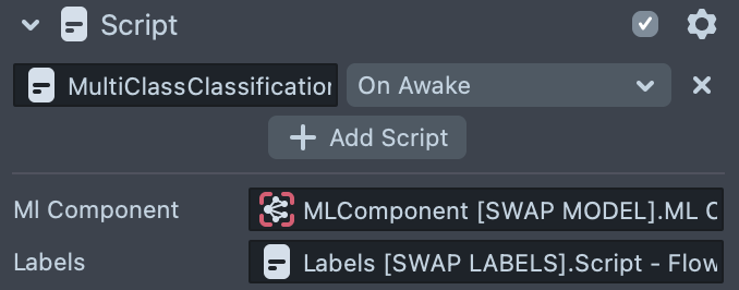Learn more about how you can run 'MLComponent' on different events (for example using a Behavior script) and with different settings in MLComponent Overview.