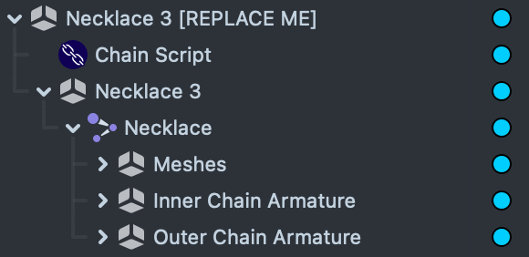 The three necklaces sit under the Necklaces Scene Object which holds the Neck Binding script.