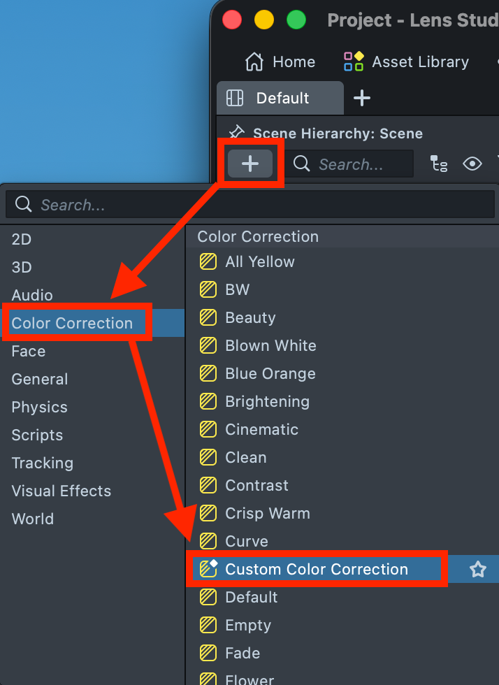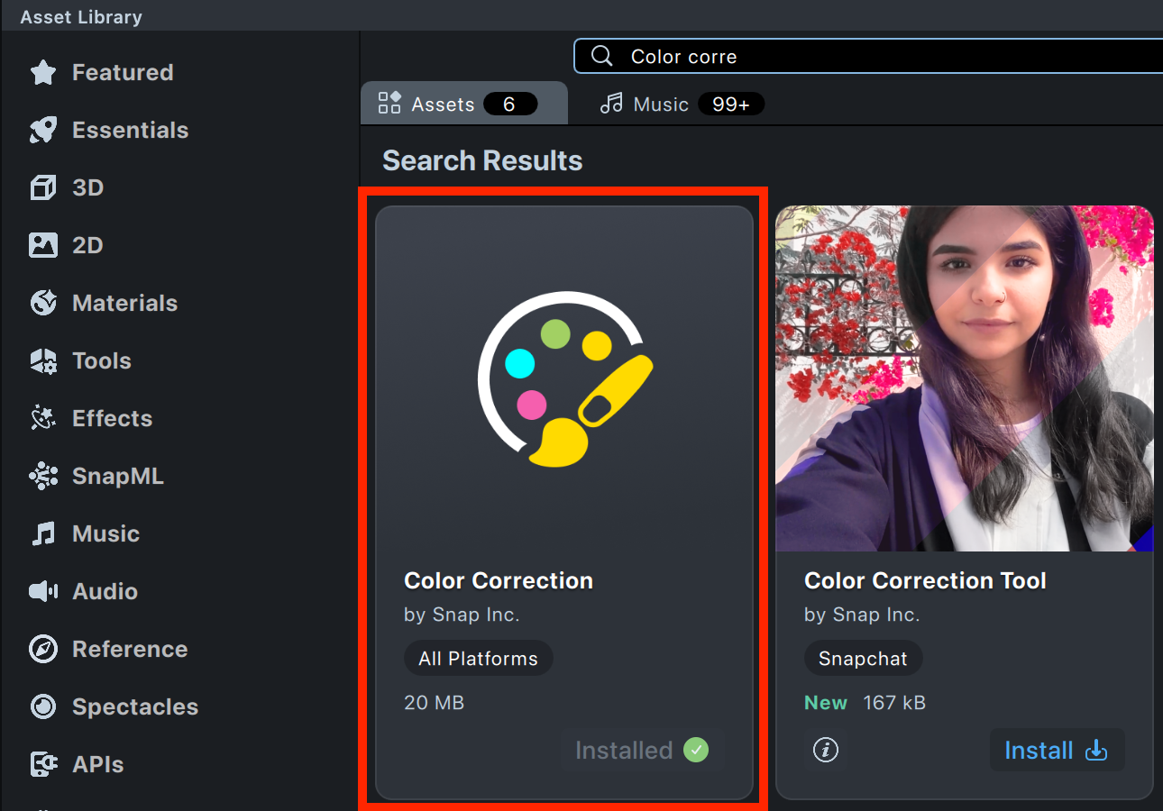 Before you begin, make sure you are using Lens Studio 5.20 or later. Then search for Color Correction in the Asset Library and install the plugin.