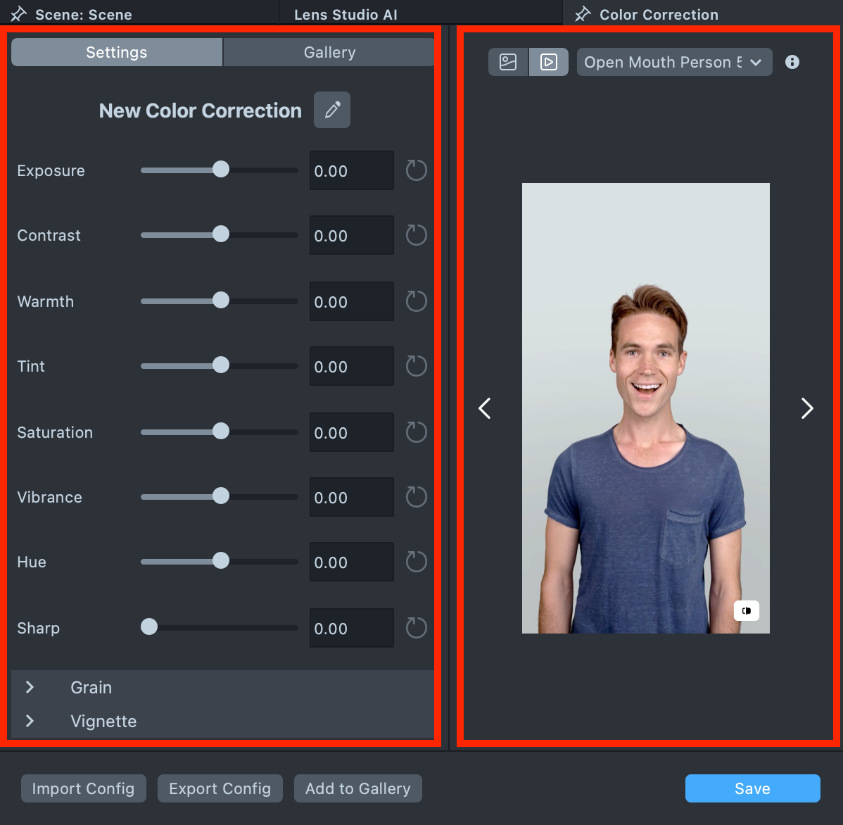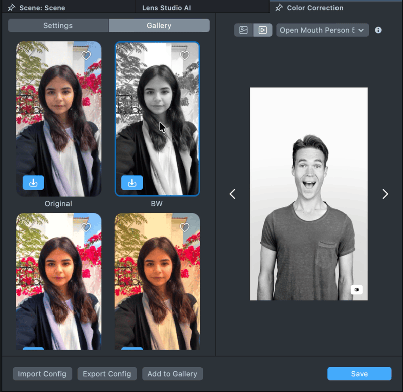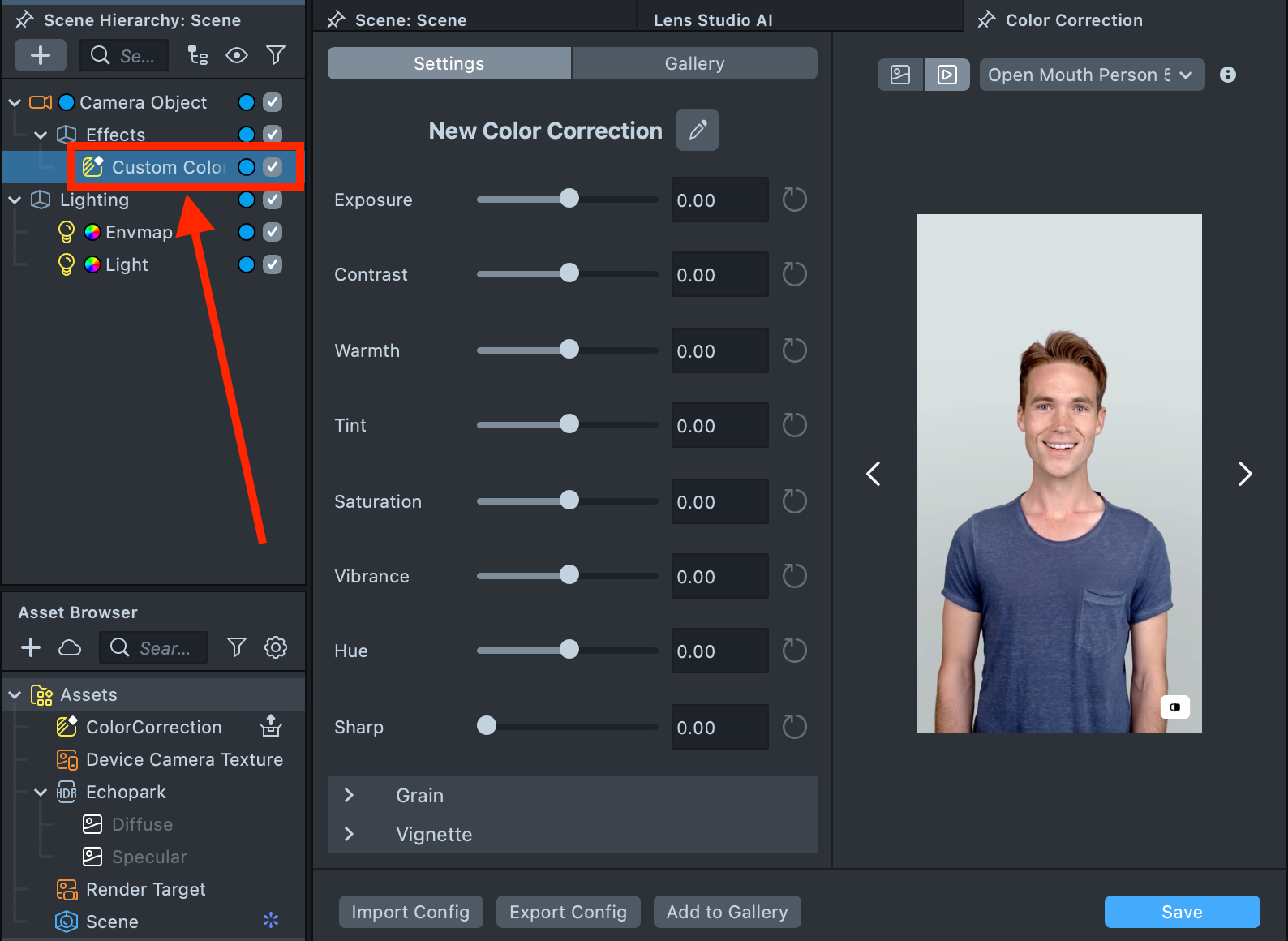 - Lens Studio adds a Custom Color Correction scene object. Double-click it to open the plugin window.