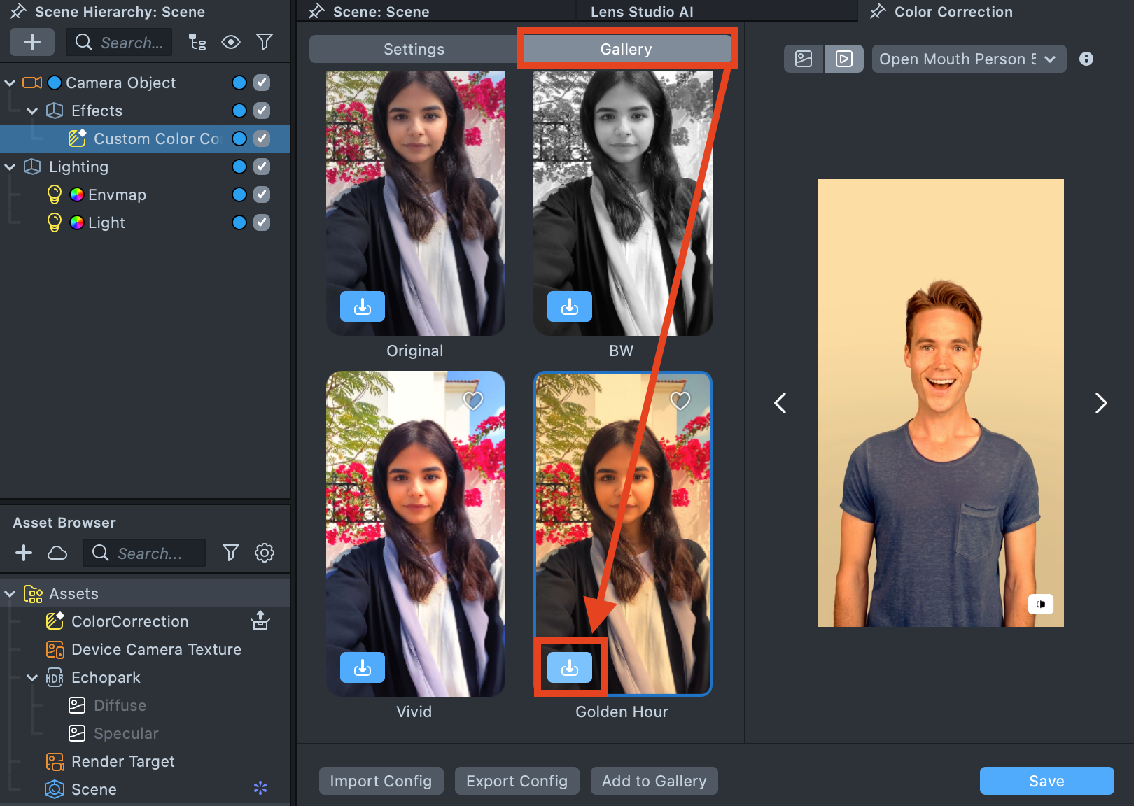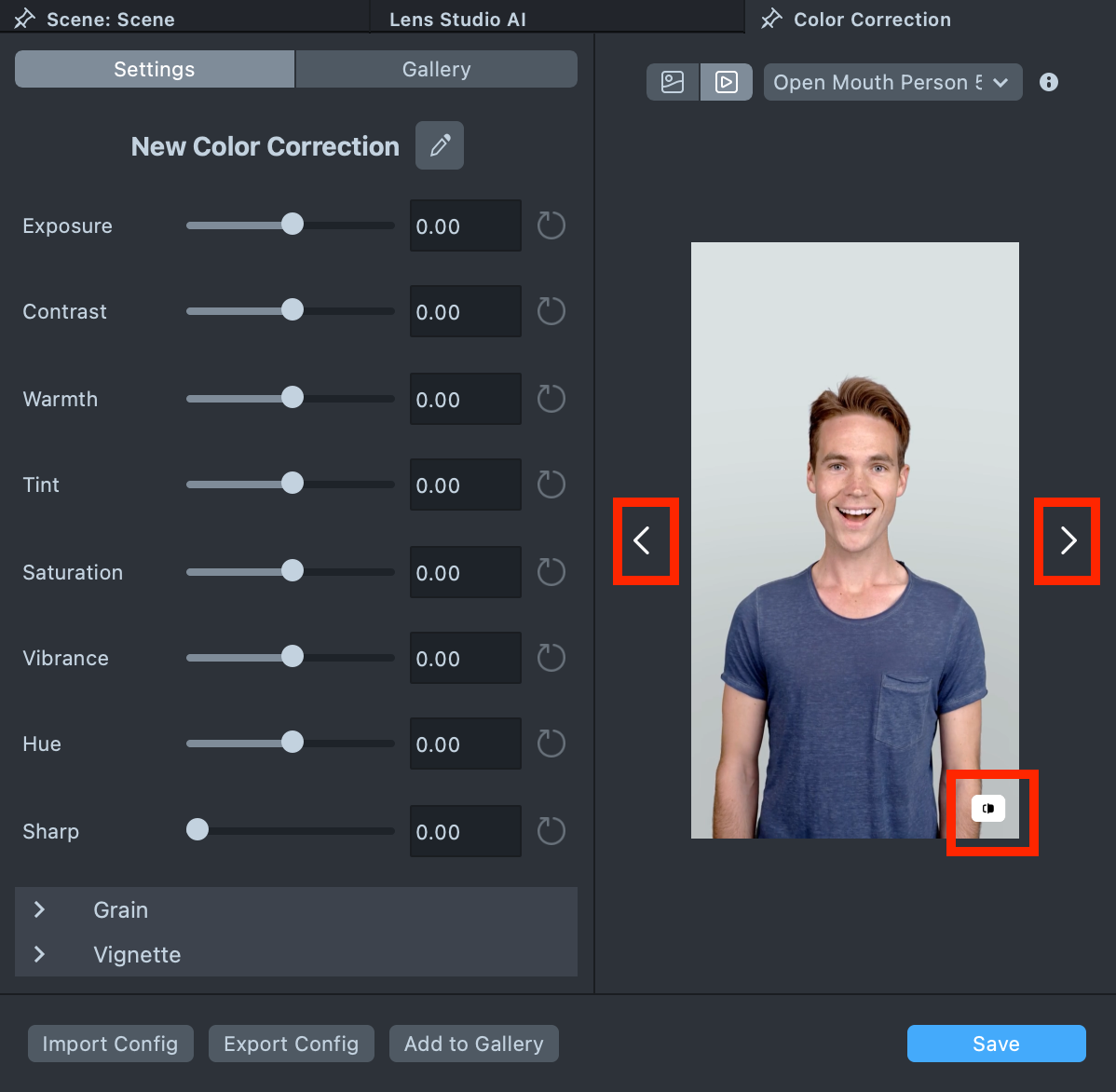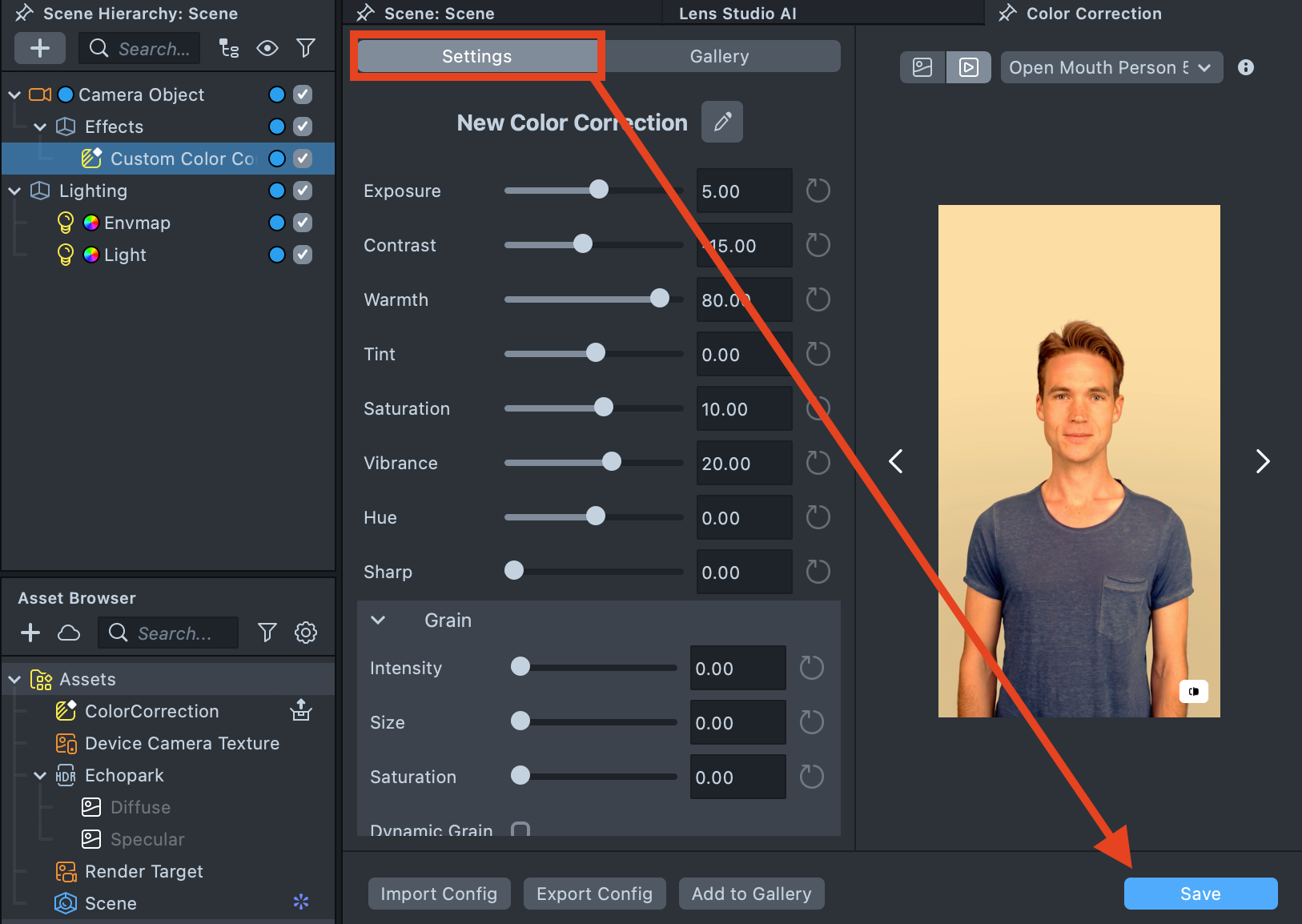 - Lens Studio adds a Custom Color Correction scene object. Double-click it to open the plugin window.