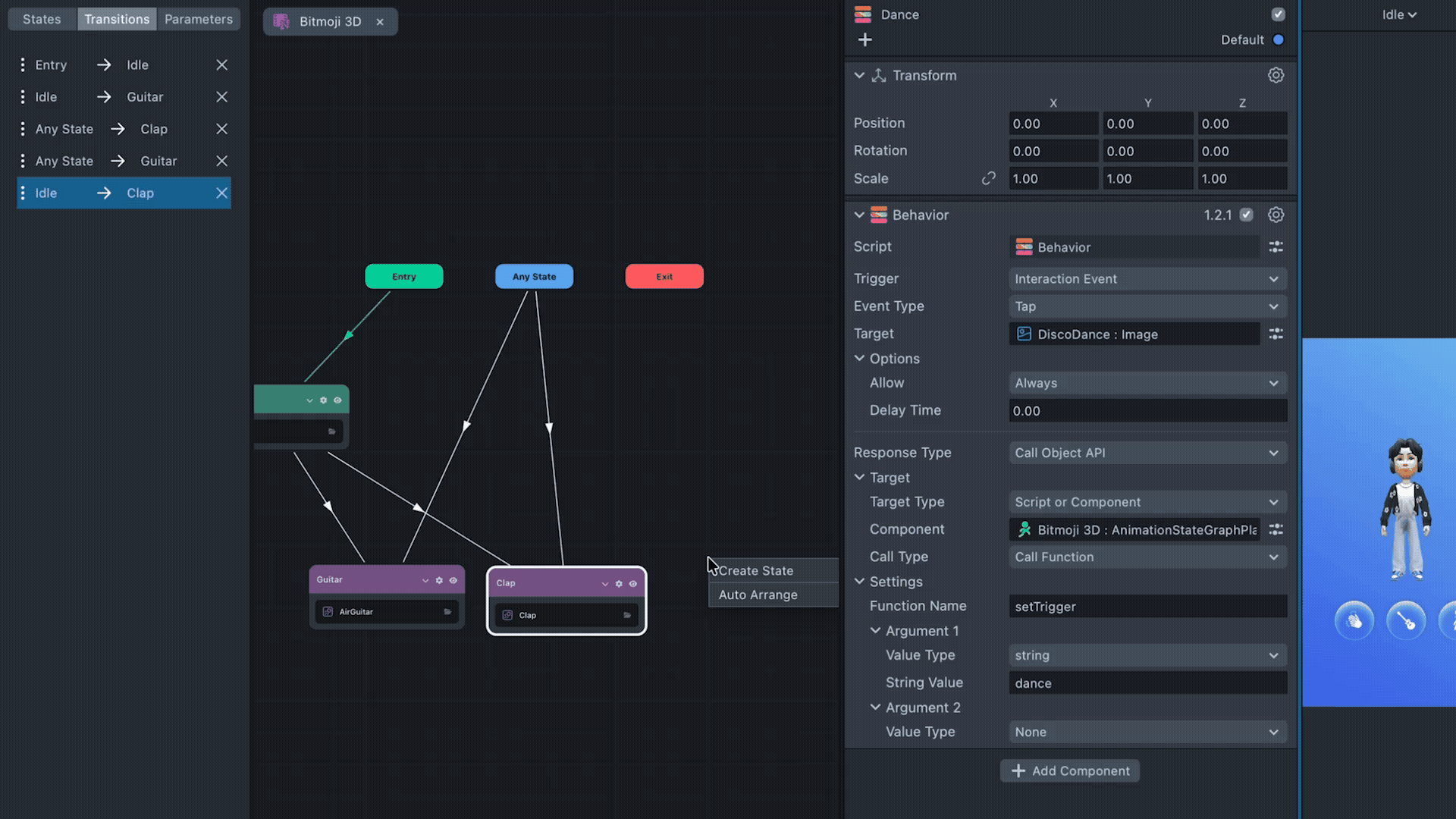 If you prefer not to write code, the Animation State Graph Player API is accessible from the Behavior script: