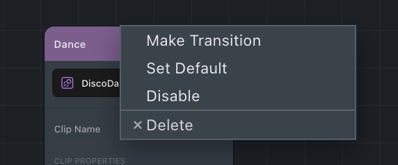Like states, transitions can be disabled temporarily. Click the eye icon in the transition editor popup to toggle a transition on or off.