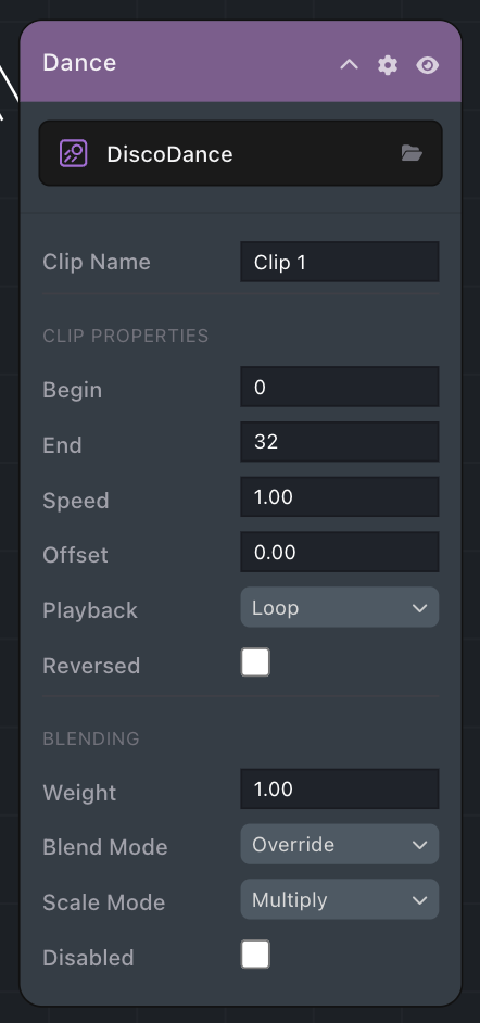 - Weight: Blend weight of this clip (0.0 to 1.0).