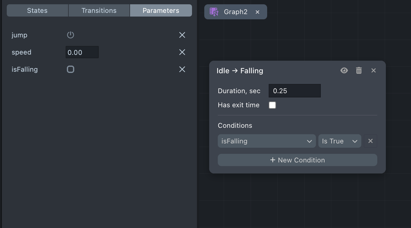 Each transition can have one or more conditions that must all be true for the transition to fire. Conditions reference parameters (defined in the Parameters tab) and use comparison operators.