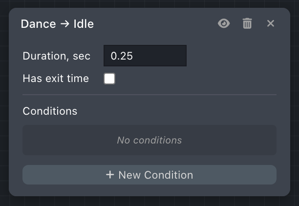 - Has exit time—when checked, the transition waits until a normalized time (0 to 1) in the source animation before it can begin. For example, 0.9 means the transition starts near the end of the current clip.
