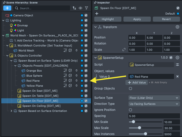 - Direction Type: Whether you want to spawn the object only when the hit test provides a certain orientation.