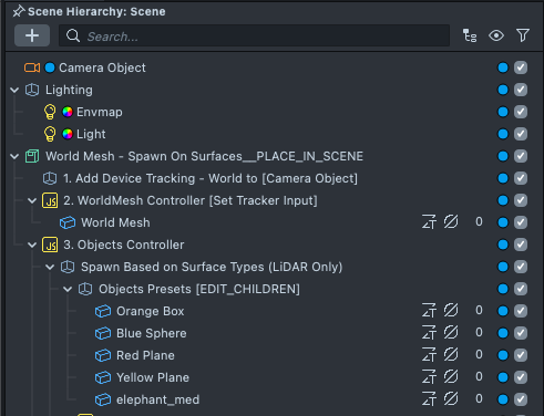 - World Mesh: A mesh that is automatically generated that represents the real world. You can use this to occlude AR effects based on the real world