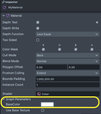 These Graph materials are unique in that they have their Frustum Culling with Extend option with a large padding so that they don’t disappear when you look away from their origin (since the instantiation can be anywhere), and have parameters that are passed in through the script which describes where they should be instantiated.