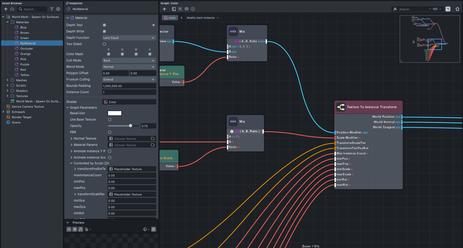Each referenced Render Mesh Visual has a special graph material. Since we are populating the world with a lot of these objects, it is more efficient to instantiate them through their material (shader), rather than with additional scene objects.