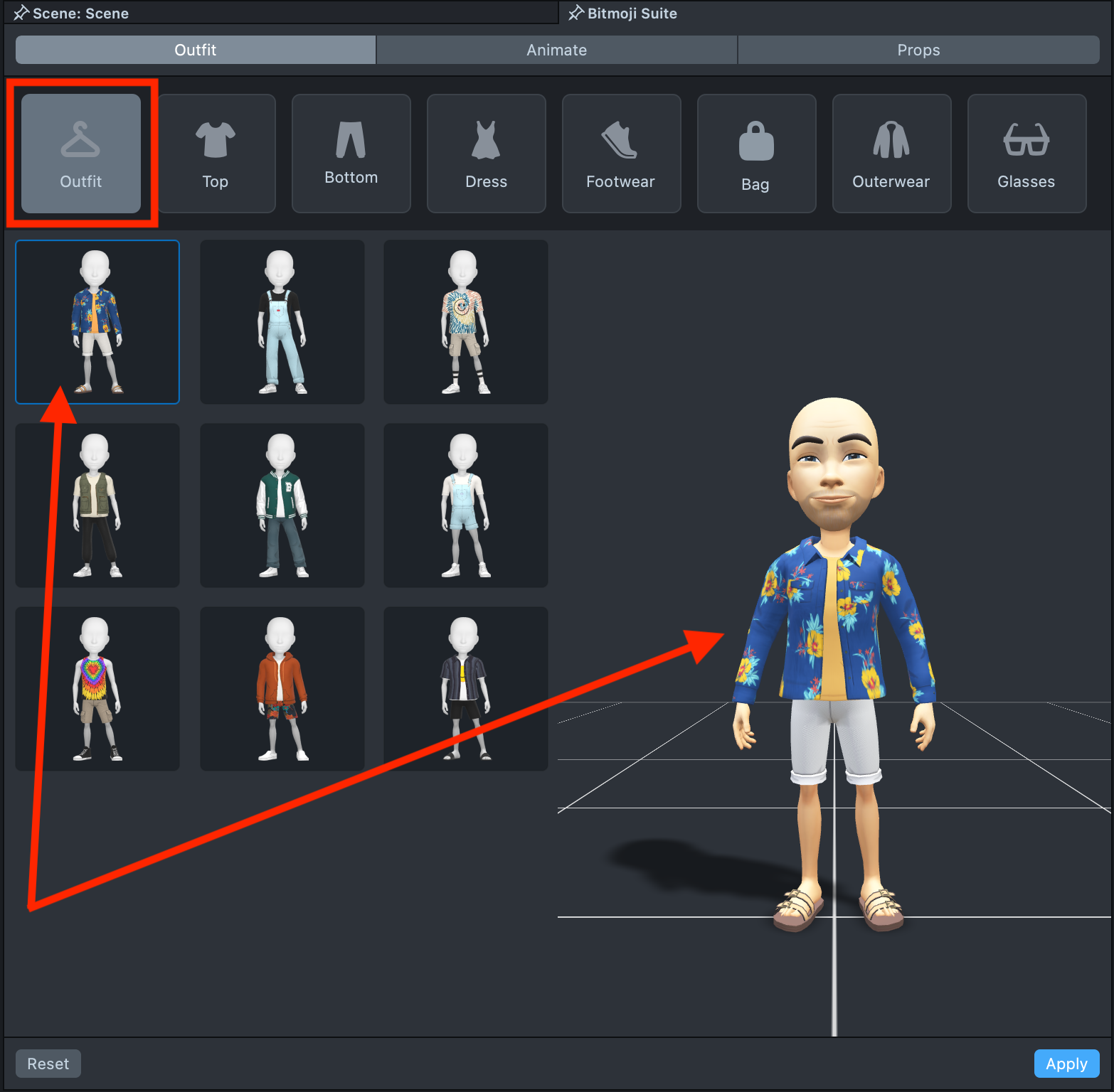 Check out Bitmoji Suite plugin for customizing Bitmoji clothes, creating animations and generating props objects!