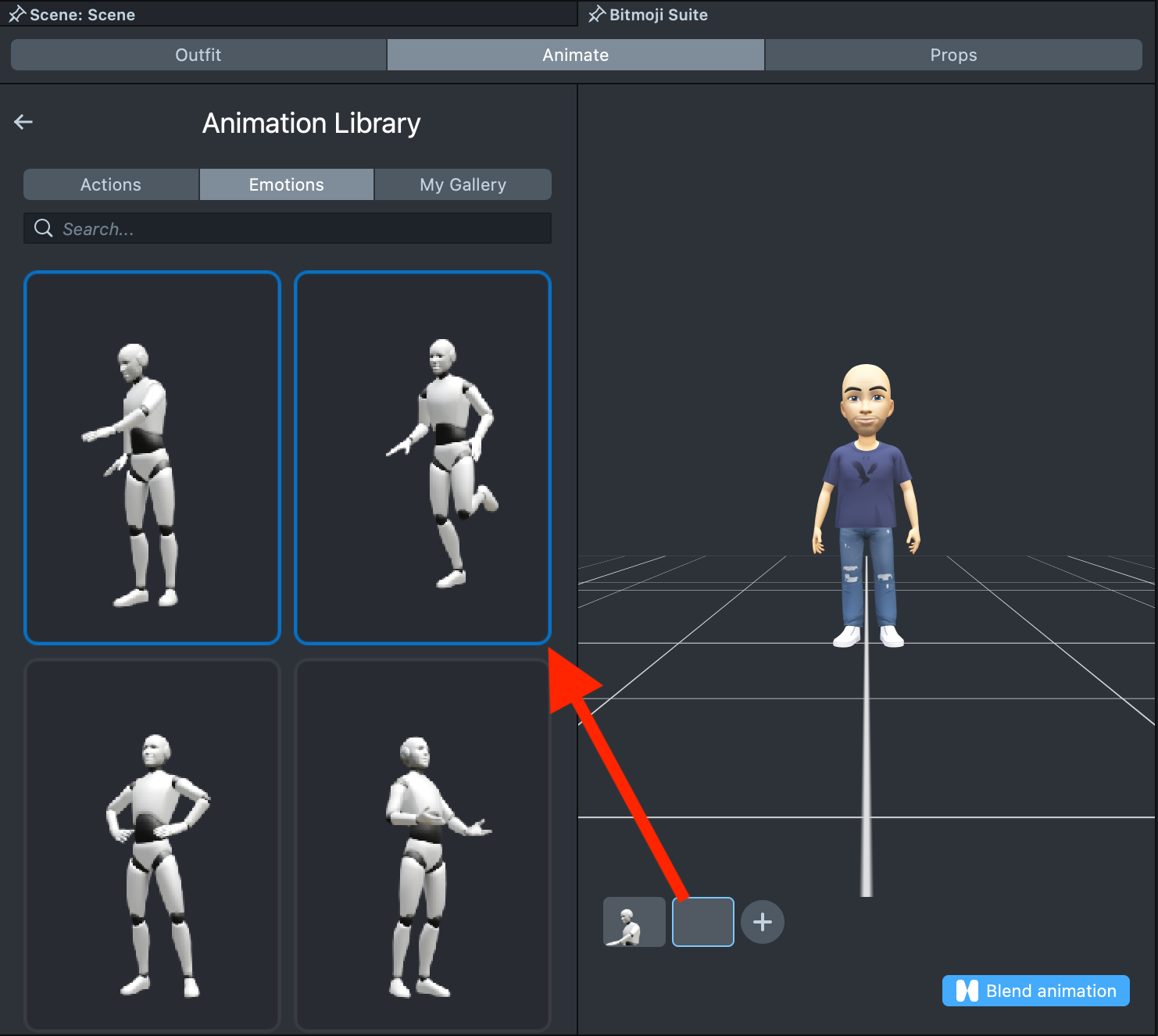 Select the first animation in the library that you’d like to stitch. A tiny preview of the animation will appear in the lower corner of the scene, along with a + button.