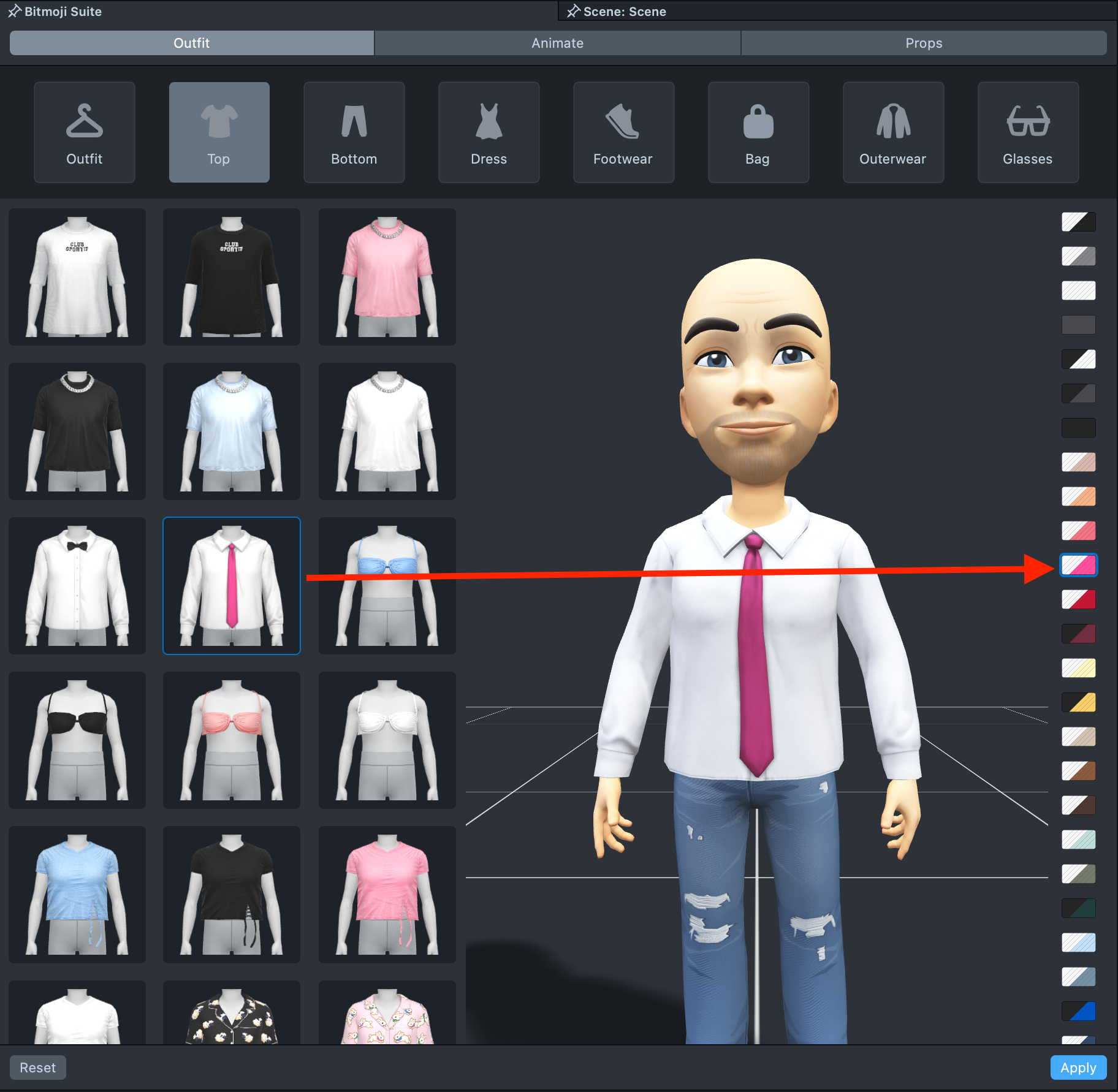 1. When you are happy with the created outfit and the Bitmoji Owner has been chosen, you can press the Apply button to apply changes to the Bitmoji in the project.