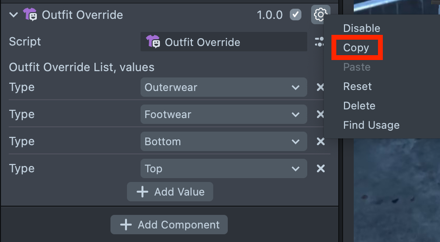 You can use the Outfit Override component to easily transfer your custom Outfit from one Bitmoji to another. This component is created automatically when you create a custom Outfit and click the Apply button. You can find it in the Inspector panel. Just copy and paste the component to do so.