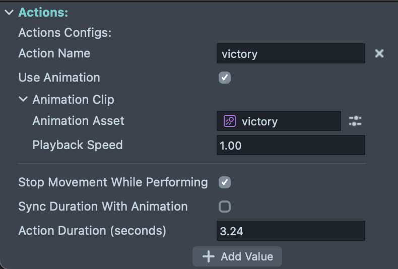| startAction(actionName: string): void | Triggers a custom action by name. Actions control animation playback and can optionally disable movement during execution. Actions must be pre-configured in the Actions settings. |