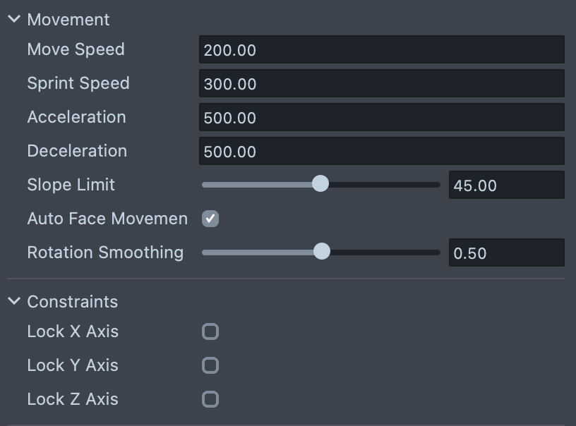 Rotation Smoothing: Controls how smoothly the character rotates towards the movement direction when Auto Face Movement Direction is enabled. Values range from 0 to 1, where 0 means instant rotation and higher values create a smoother, more gradual turning animation.