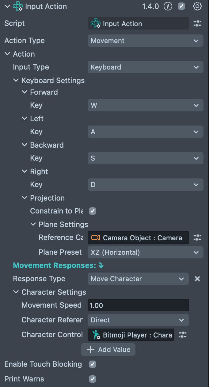 | Movement Responses: | MovementResponseConfig[] | A list of actions to perform in response to the movement input (e.g., move an object). |