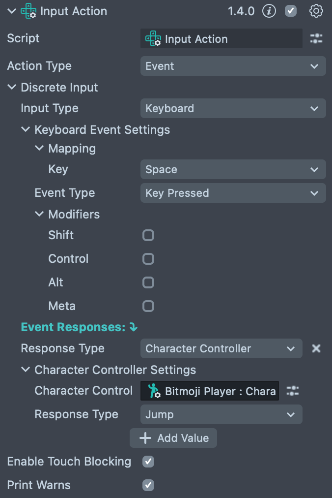 The Input Action component is a modular way to map different user inputs (joystick, taps, keyboard, face events, microphone volume, Wired Params) to high-level actions in your Lens. It centralizes input wiring and lets you compose multiple responses such as moving a character, rotating an object, triggering behaviors, or calling into other components.