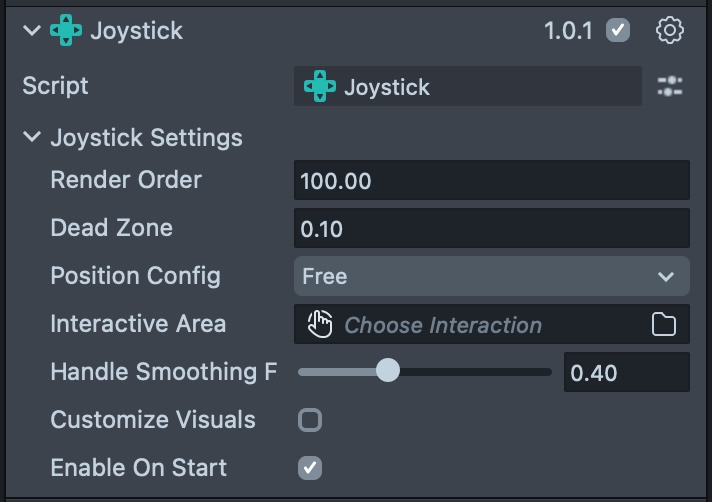 | interactiveArea | InteractionComponent | (Only shown if positionConfig is Free) Constrains the Free joystick to a specific screen area. If unassigned, the joystick can be activated from anywhere. |
