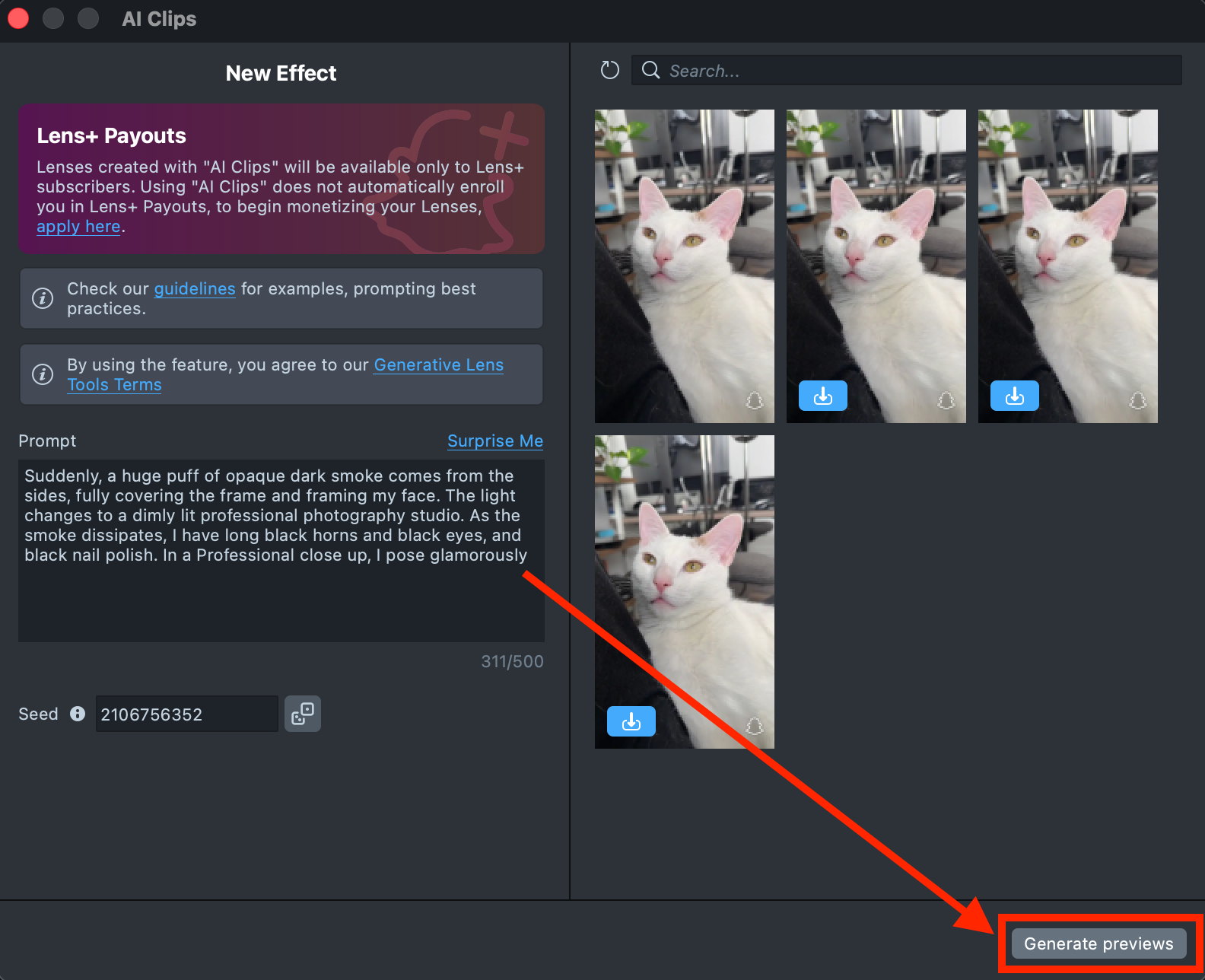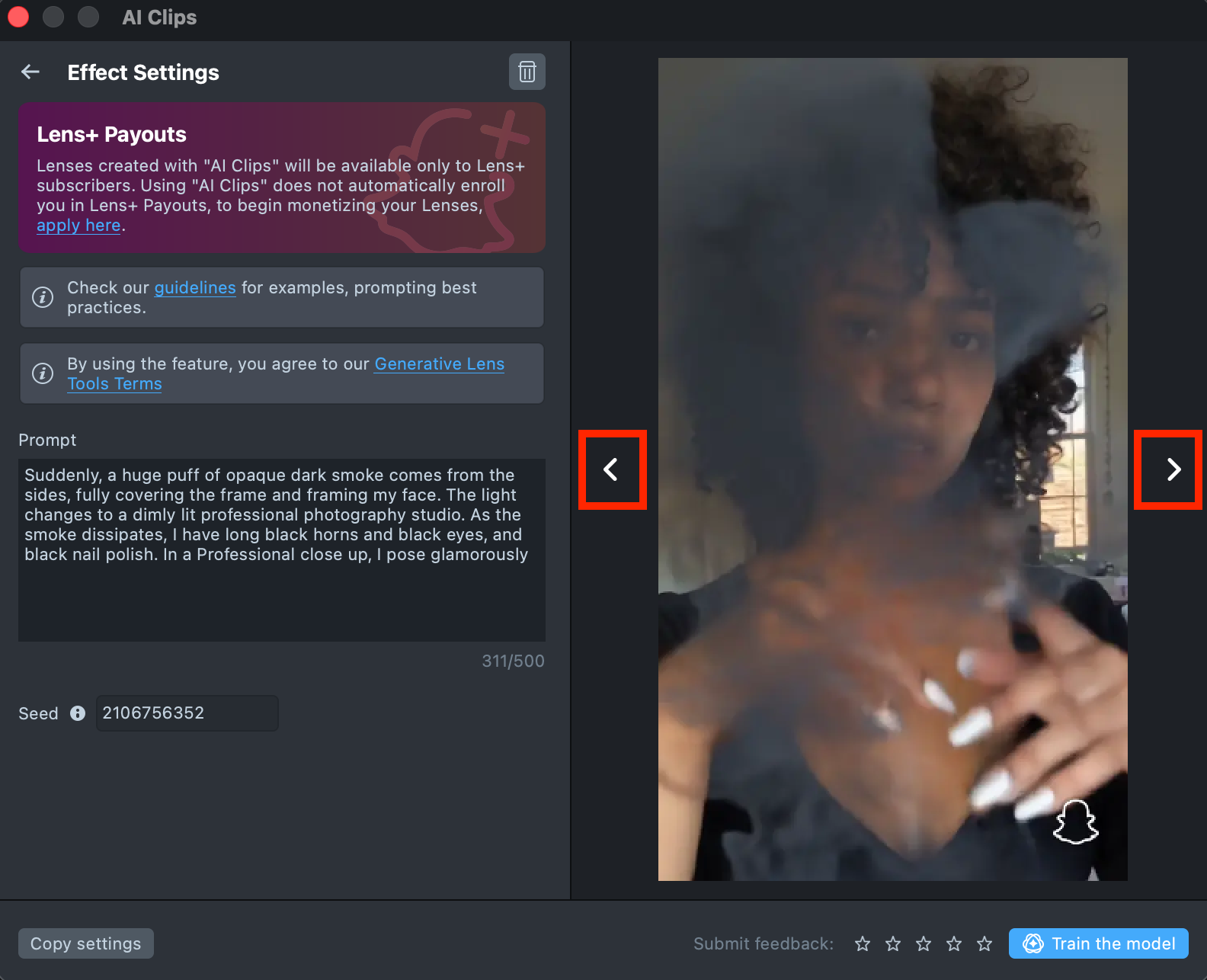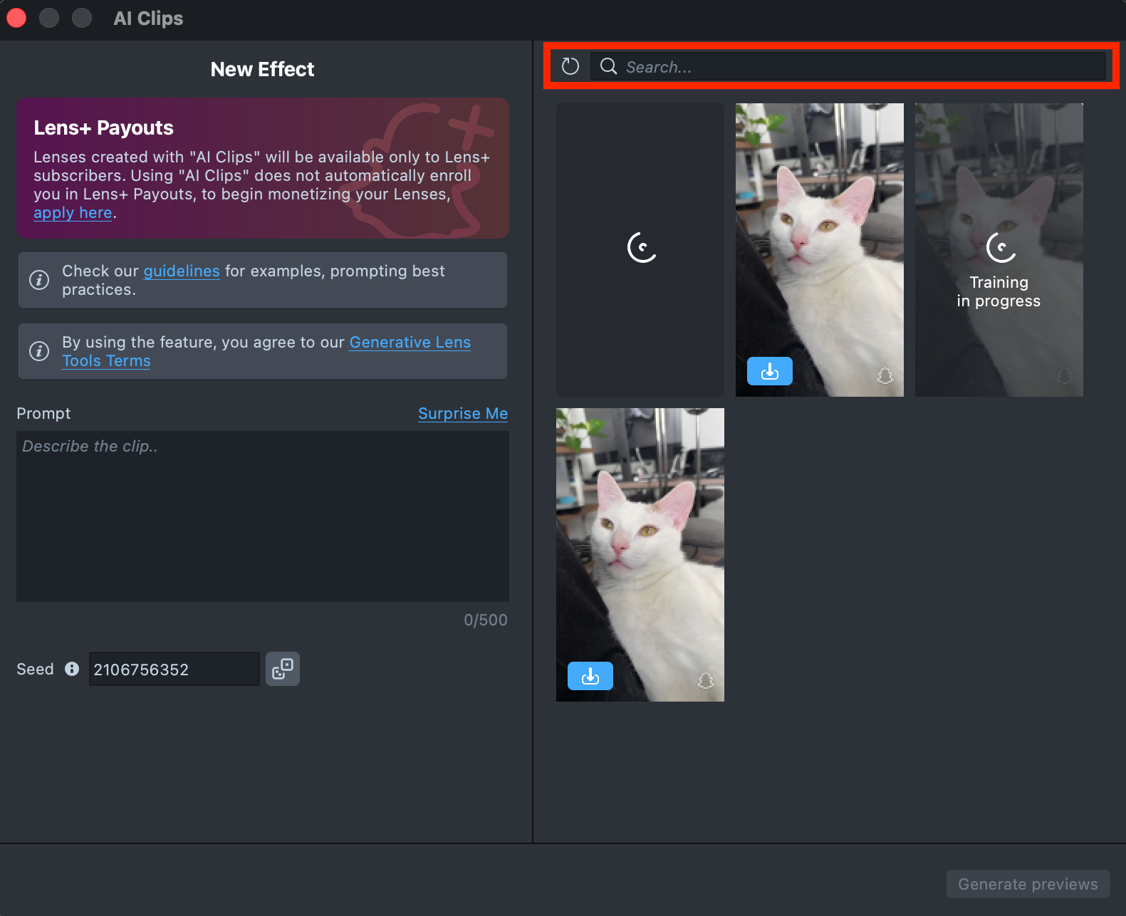 Lenses created with AI Clips plugin will be available only to Lens+ subscribers. Using AI Clips does not automatically enroll you in Lens+ Payouts, to begin monetizing your Lenses, apply here.