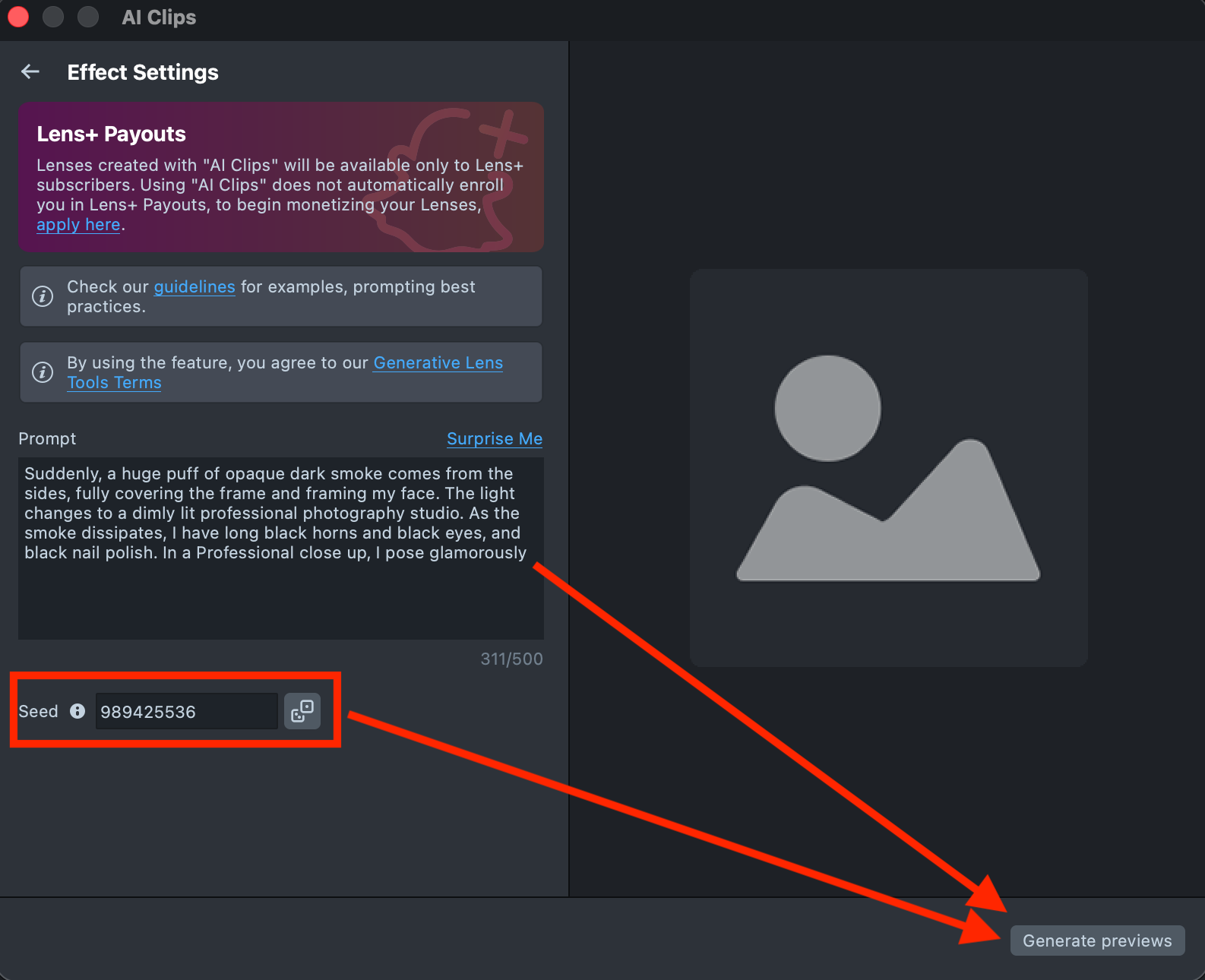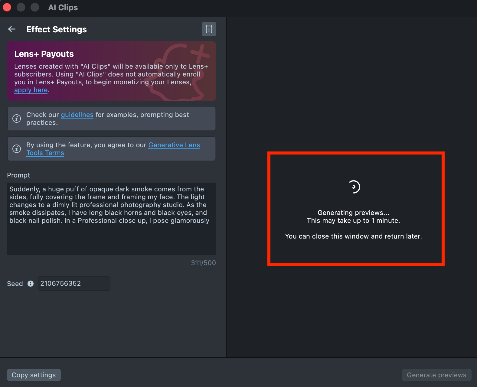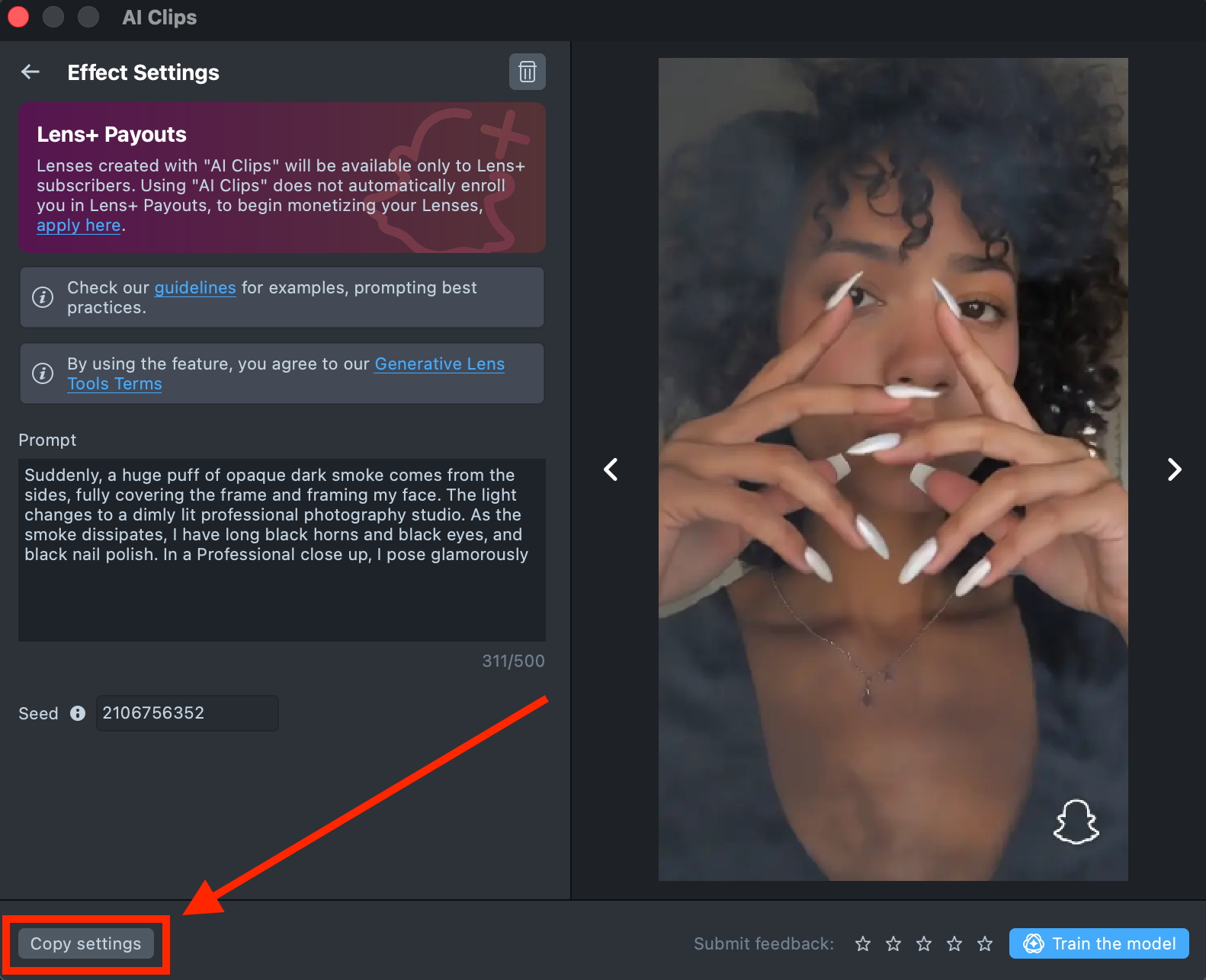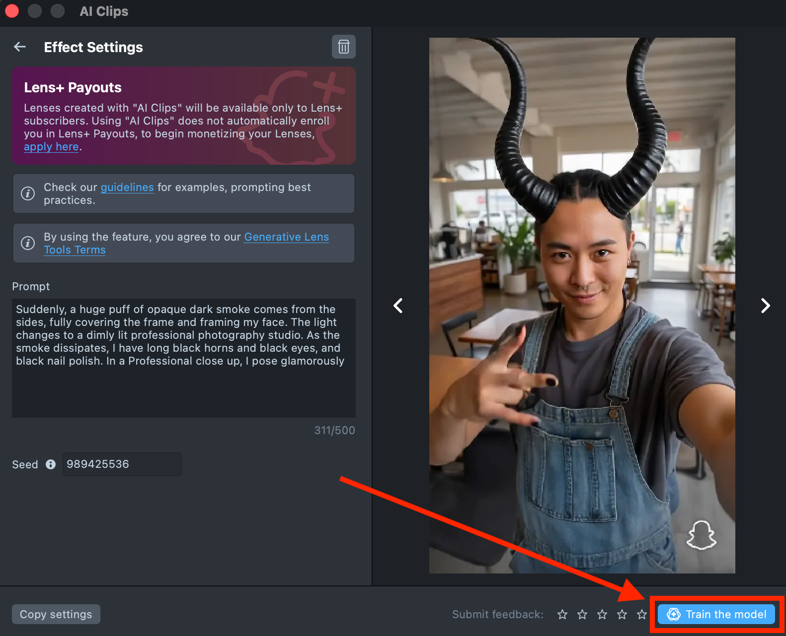 Lenses created with AI Clips plugin will be available only to Lens+ subscribers. Using AI Clips does not automatically enroll you in Lens+ Payouts, to begin monetizing your Lenses, apply here.