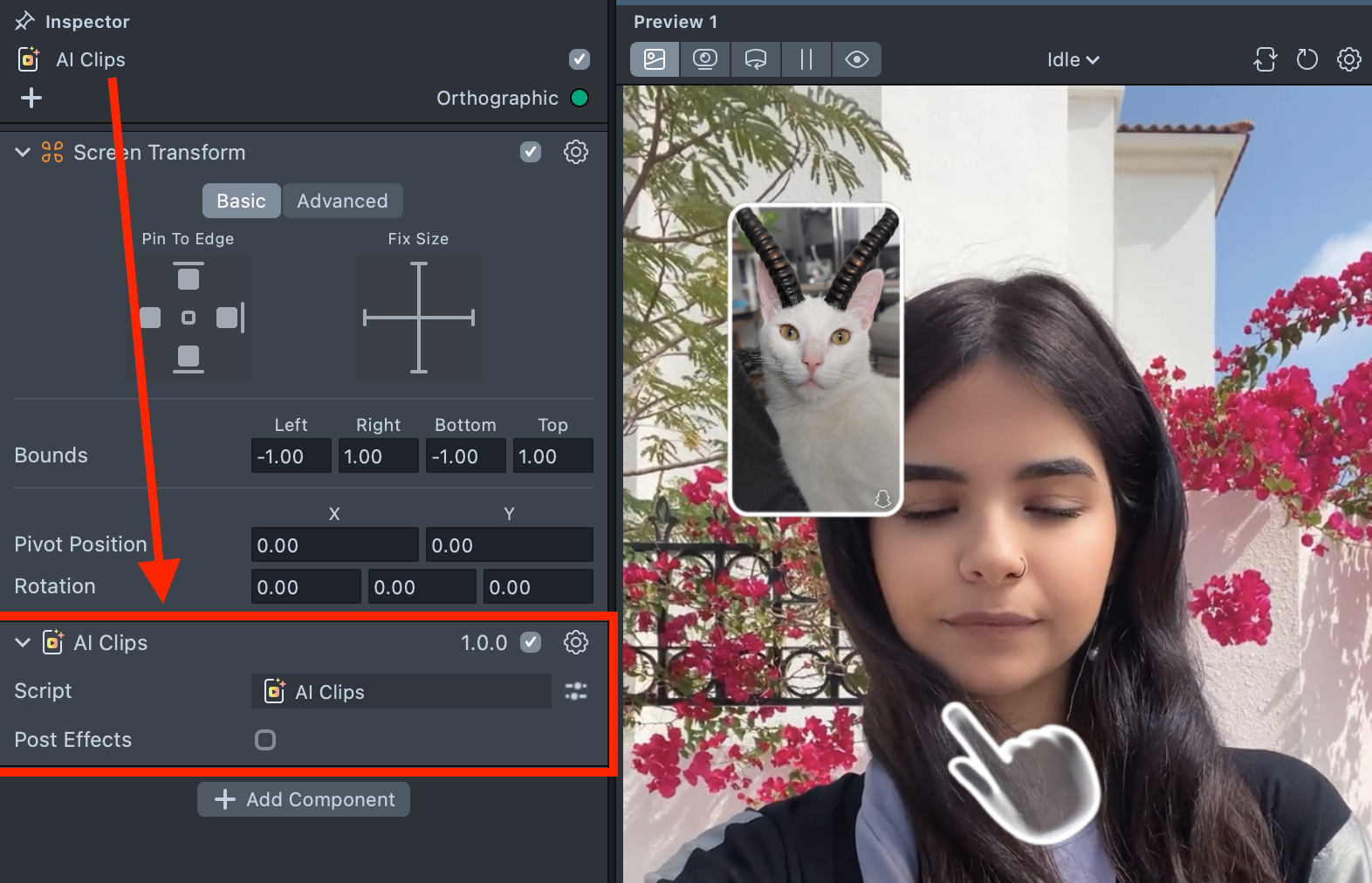 The imported component already includes all the necessary logic, a hint, and a default transition - essentially giving you a ready-to-use Lens. You can tap on the Preview screen or push the project to a device to see the Lens in action.