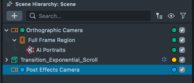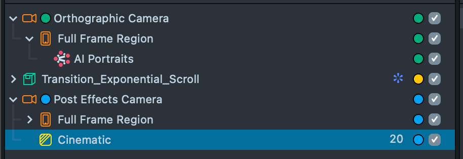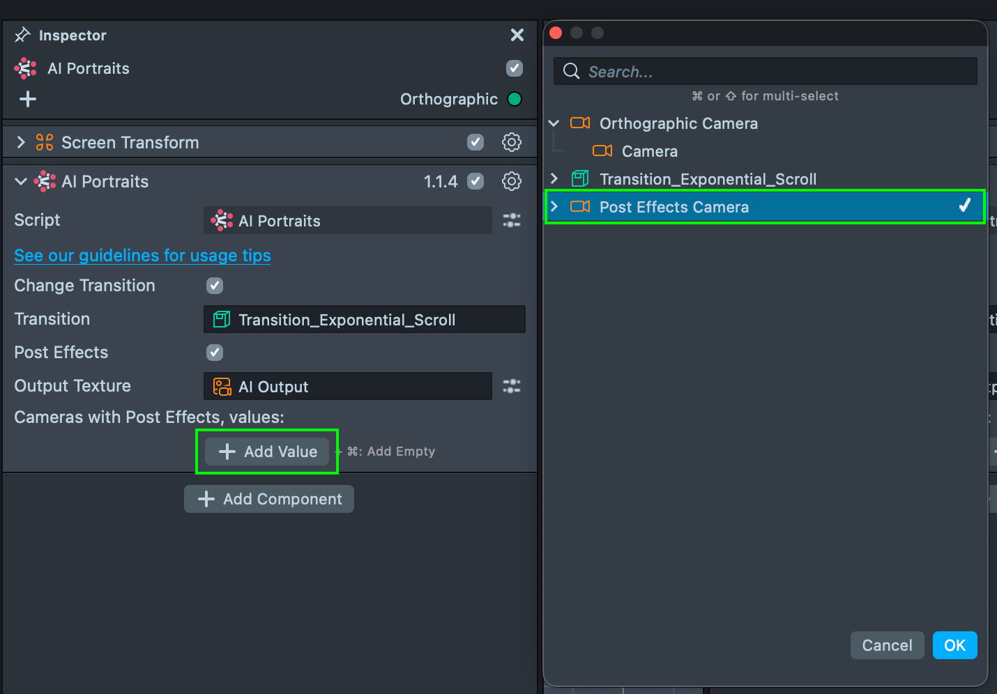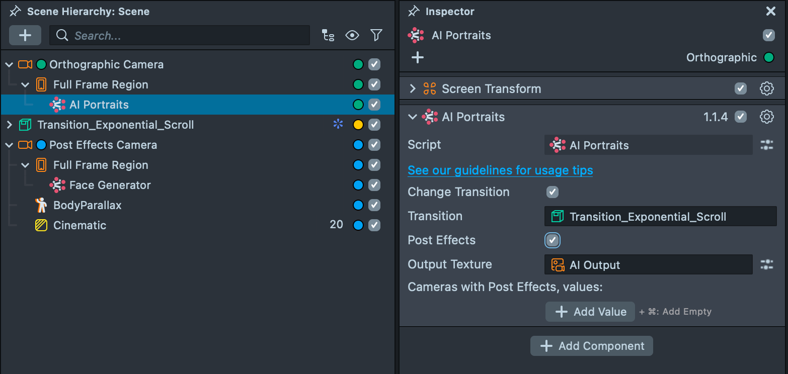 7.1. After adding and configuring your post effects, the next step is to apply them to the AI Portraits output. Earlier, you enabled the Post Effects checkbox in the AI Portraits component while locating the AI Output texture.