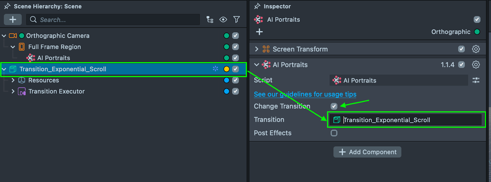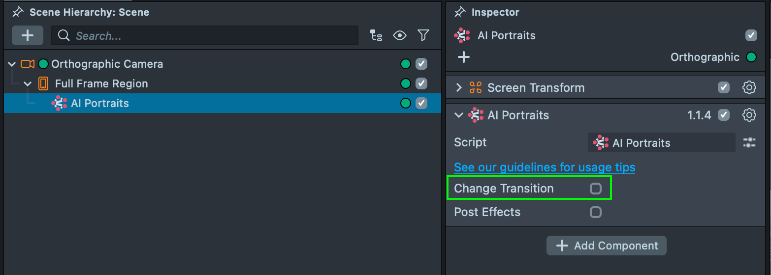 2.3. Enable the Change Transition checkbox in the AI Portraits component and link the transition’s parent object that you imported earlier.