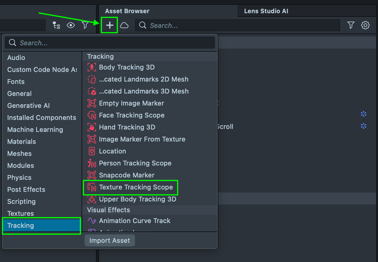4.5. We also need to further configure the Face Generator to ensure it works correctly. To apply the Face Generator on top of the AI Portraits image, we must add an additional component to the project: the Texture Tracking Scope. To add it, click the + button in the Asset Browser, navigate to the Tracking category, and select Texture Tracking Scope. This is necessary for the tracking to function properly on the generated output.