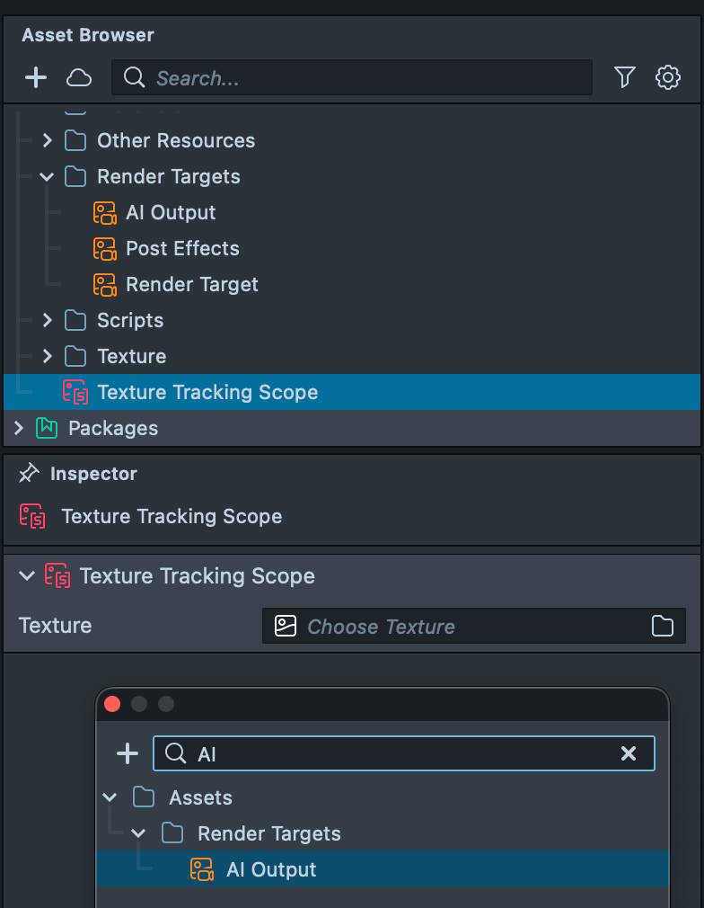 4.8. In the Asset Browser, select Texture Tracking Scope. The Texture field is currently empty: drag and drop the AI Output texture into this field.