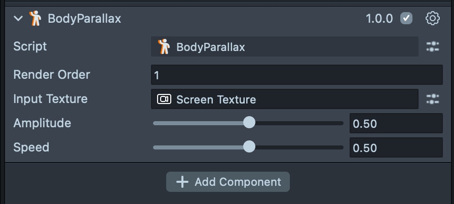 6.4. In the Scene Hierarchy, select Body Parallax and set Screen Texture as the Input Texture in the Inspector.