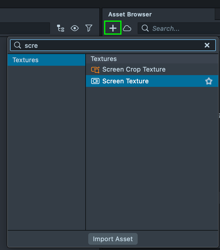 6.3. Add the Screen Texture by clicking the + button in the Asset Browser.