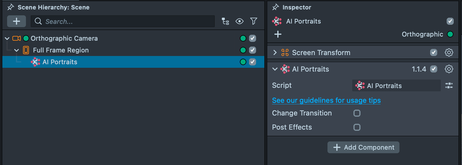 4.6. Next, locate the AI Output texture: in the Scene Hierarchy, select AI Portraits and enable the Post Effects checkbox in the AI Portraits component. This will reveal the AI Output texture.