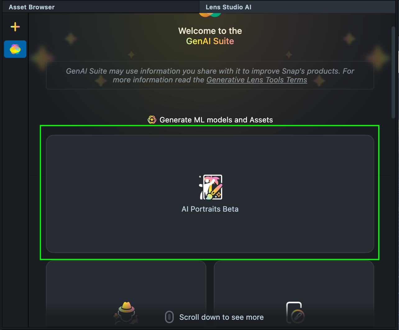 1.1. Navigate to the Lens Studio AI option in the top right corner of the Lens Studio. Then, click on the GenAI Home Page tab in the sidebar.