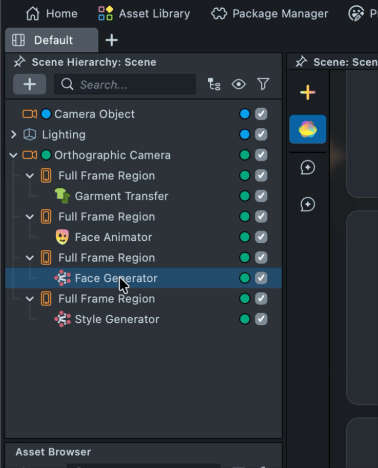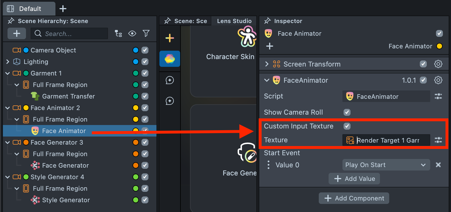 2.19. You may notice that the Style Generator effect appears on top of the Camera Roll button. This behavior is built into the Face Animator component to simplify workflows for basic Lenses. However, this built-in logic does not handle complex camera and effect structures correctly. To resolve this, open the Face Animator component and disable Show Camera Roll.