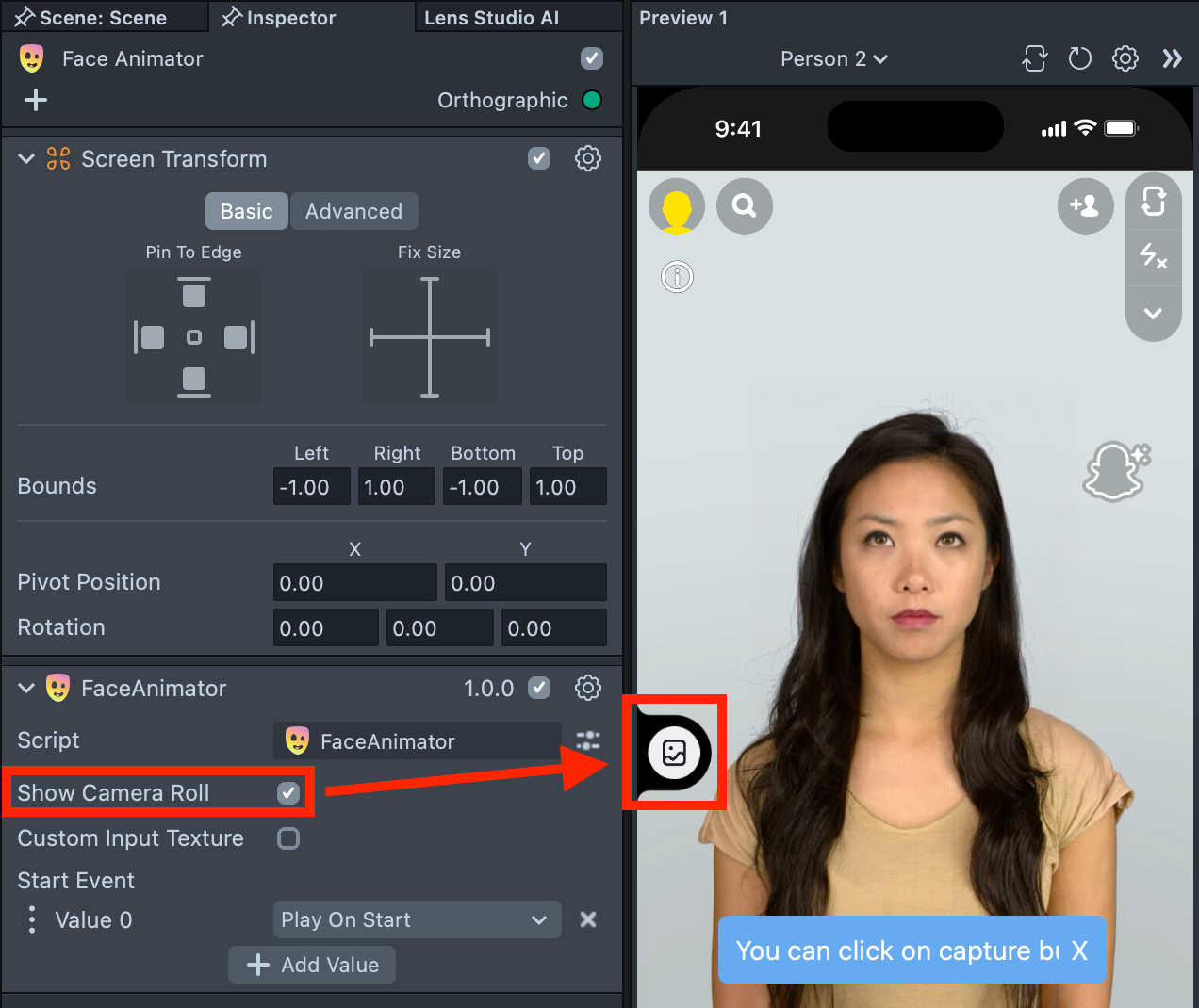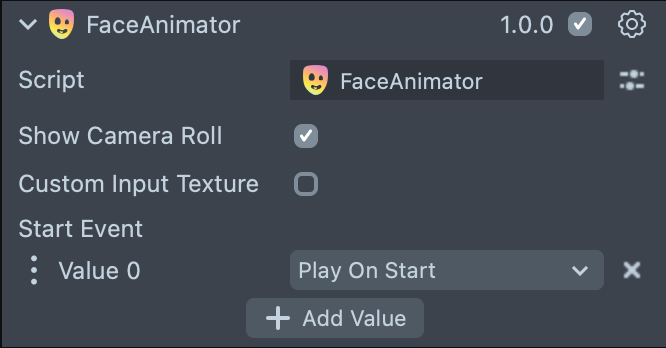 Start Event option, by default, triggers your Face Animator effect as soon as the lens starts, but you can easily change this to any other event.