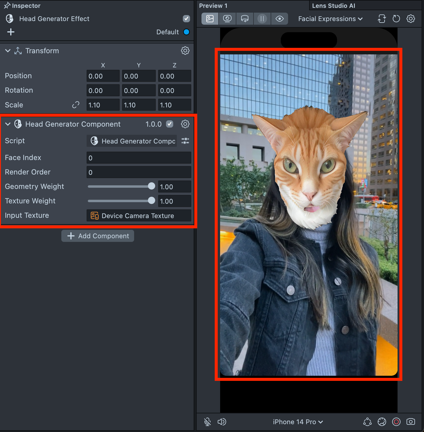 In the project, you will find the created component along with a preview of the 3D Head you generated. Take a look at the Pairing to Snapchat guide to test your Lens on device, and the Publishing guide to learn more about sharing your creation.