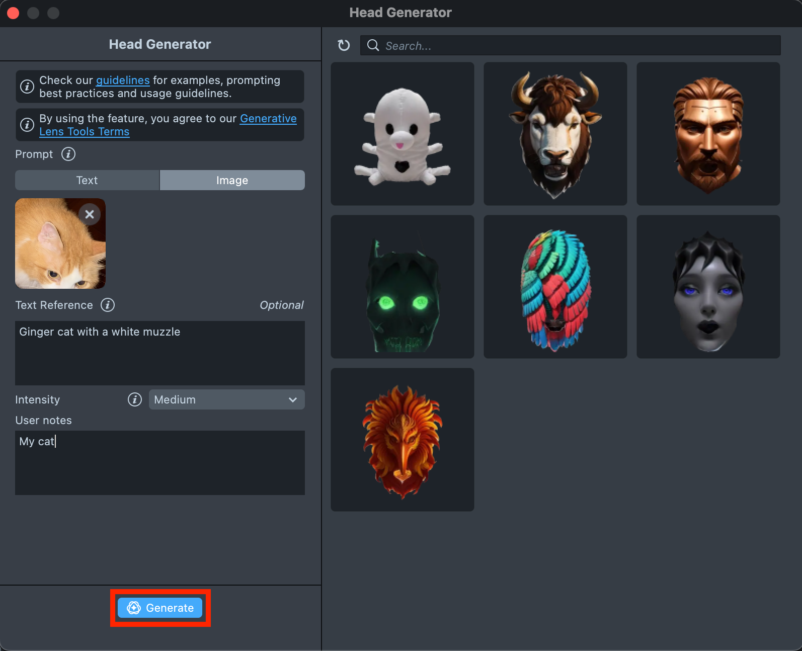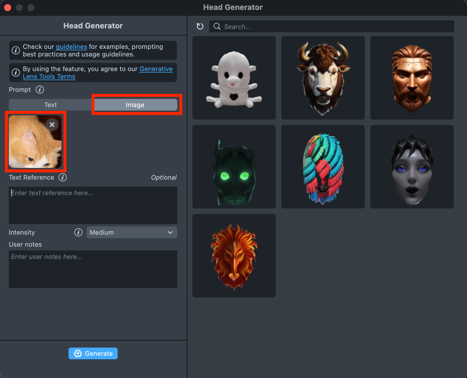 Head Generator is a powerful tool for generating and customizing 3D heads for creating Lenses. It uses AI to generate a 3D head, which can then be driven by facial expressions, similar to Face Morph.