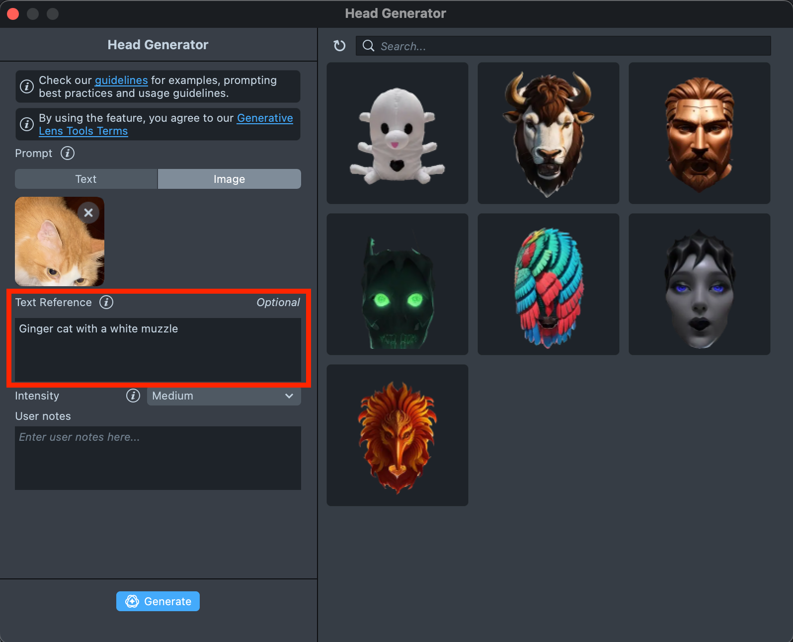 Text Referencefield to add context - for example, specify which part of the image should be used for generating the 3D Head or what modifications should be applied.