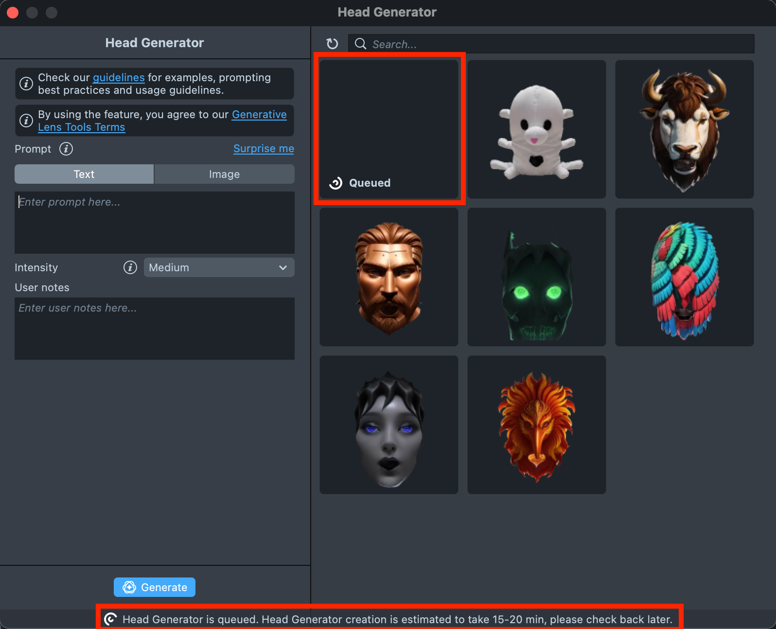 In the top-left corner of the Gallery, you will see that your generation request has been placed in the queue. The Status Bar at the bottom will indicate that generation takes about 15–20 minutes. You can close the window and return later.
