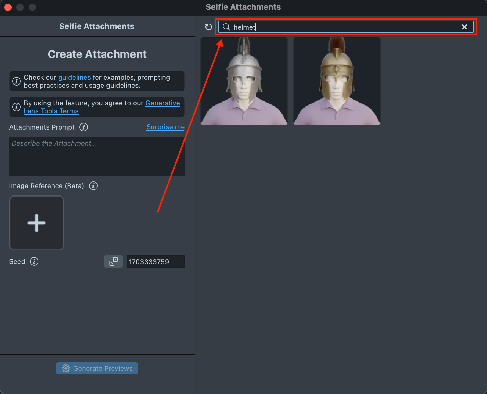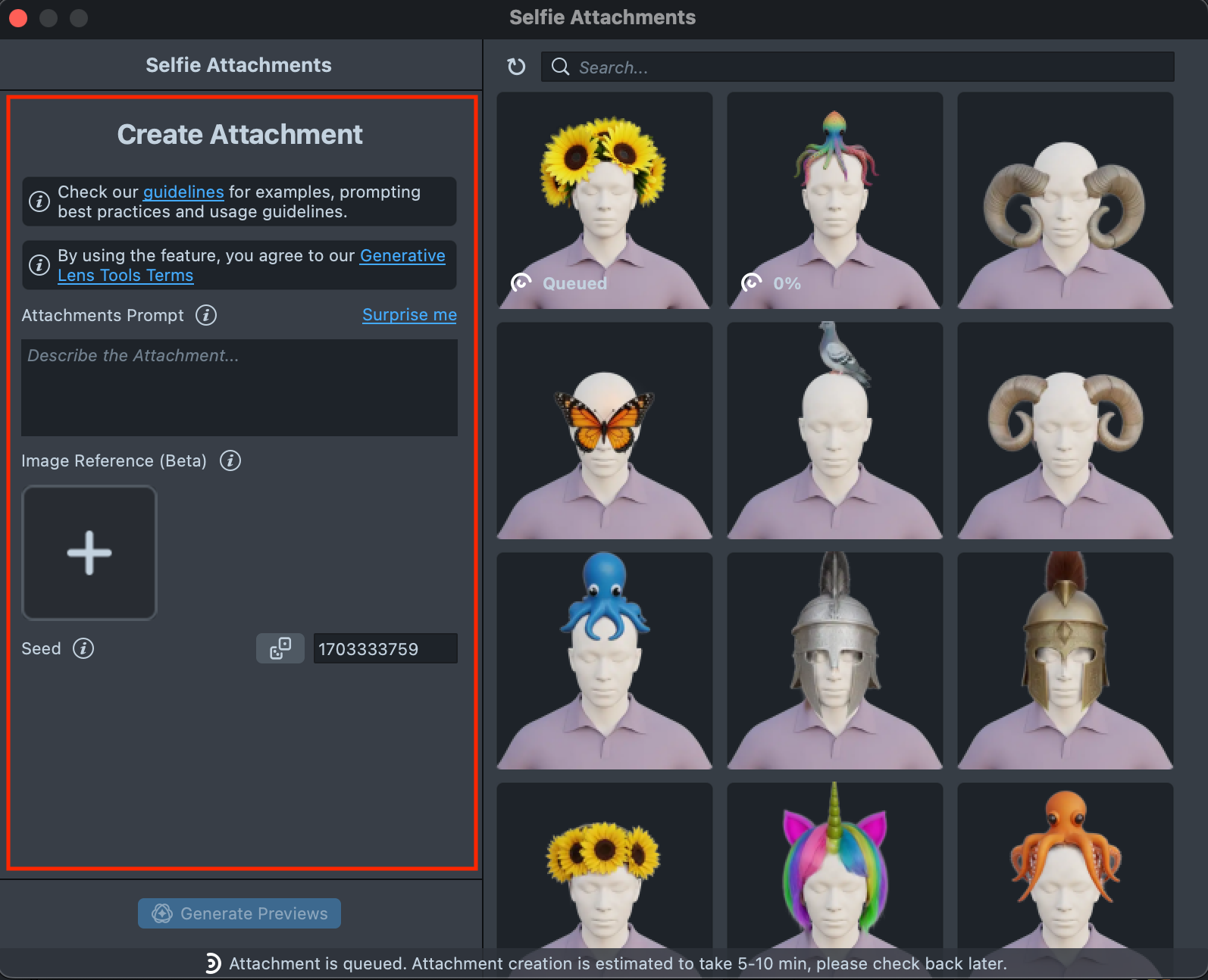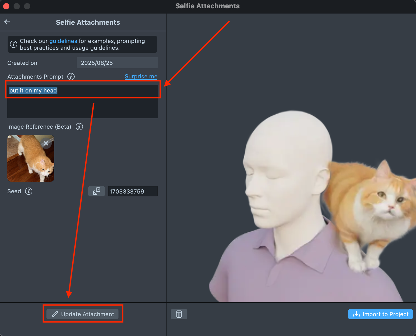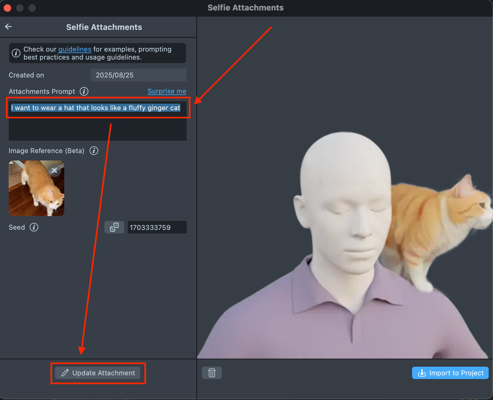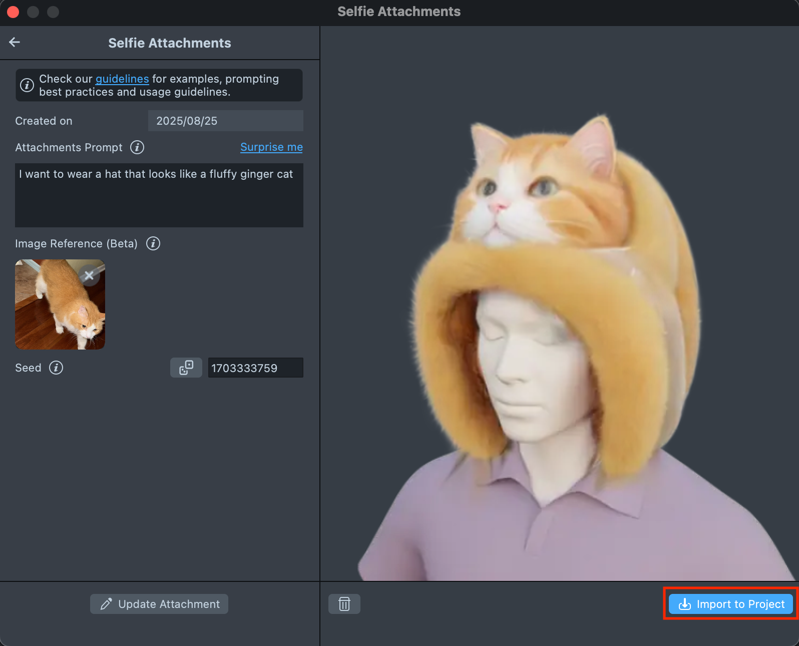 When the Attachment is ready, you can review it and adjust the asset by changing the prompt and seed. For example, you can provide a detailed description, or simply say "put it on my head" - both options work! Just hit the