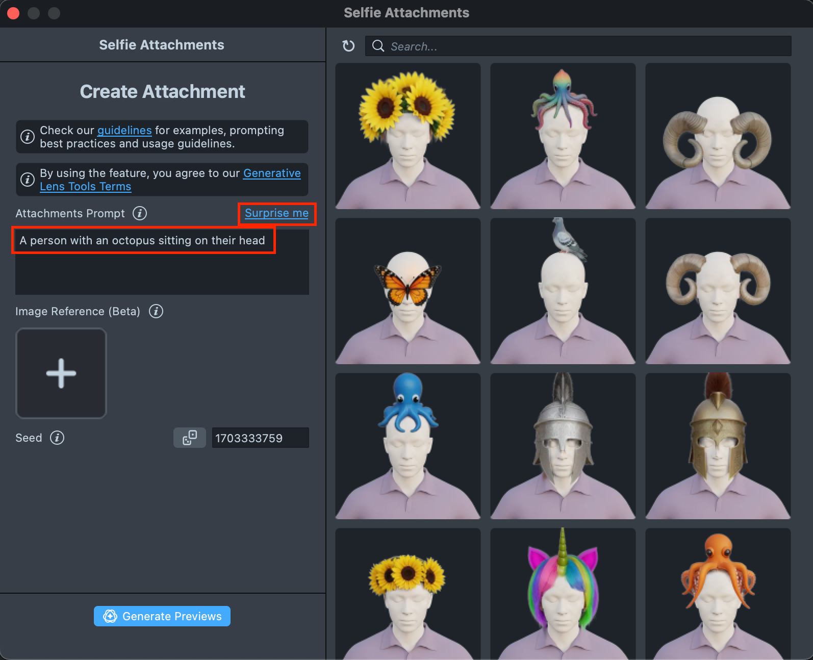 If you are ready to use your own prompt, enter a description of the Attachment you’d like to generate in the "Attachments Prompt" text field (up to 200 characters). Use seed to reproduce experiments and control the randomness of generation.