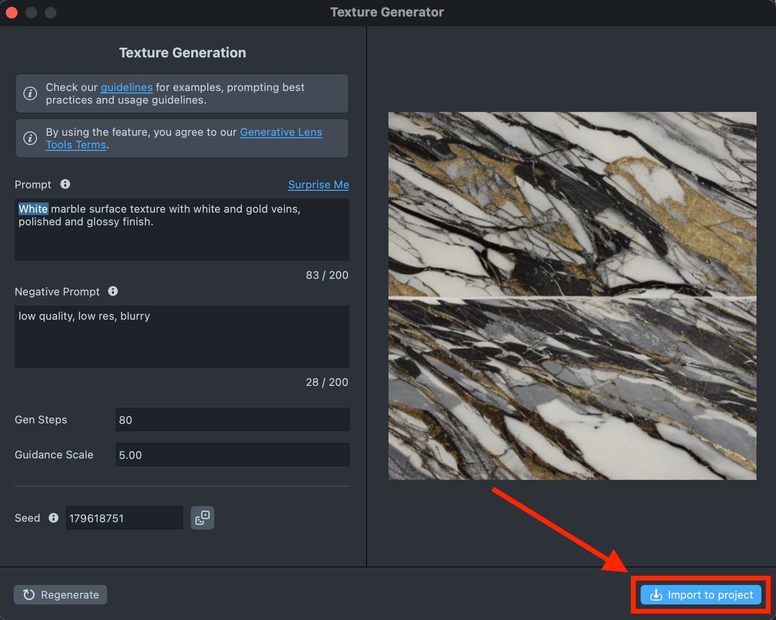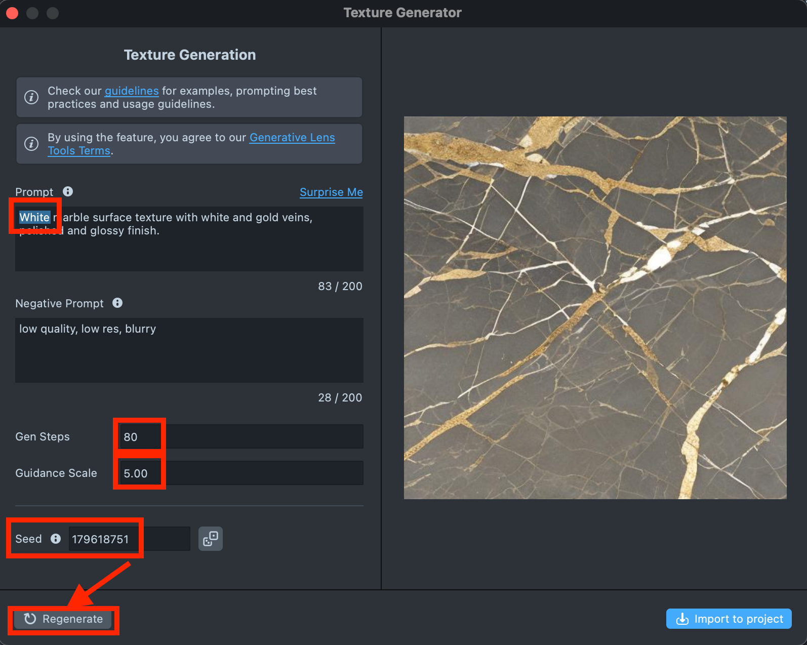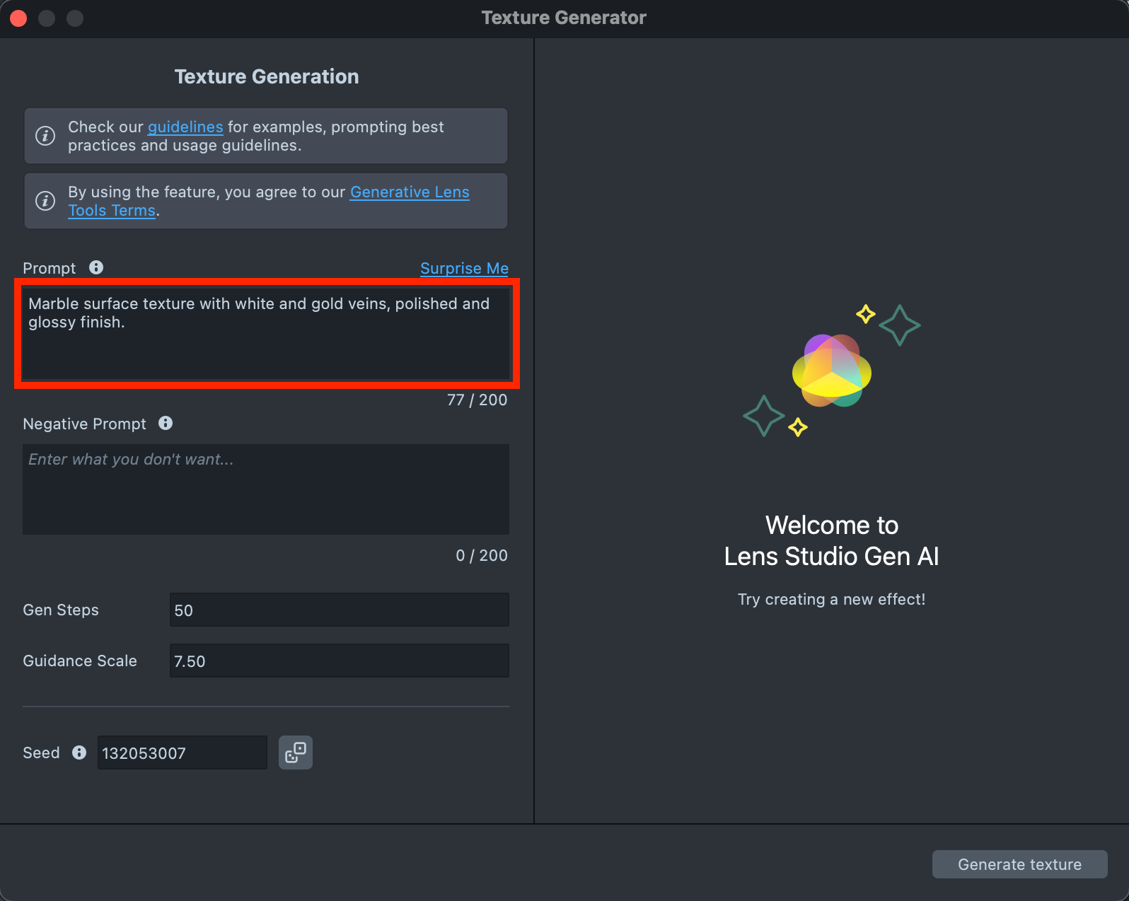 If you are ready to use your own prompt, enter a description of the texture you’d like to generate in the