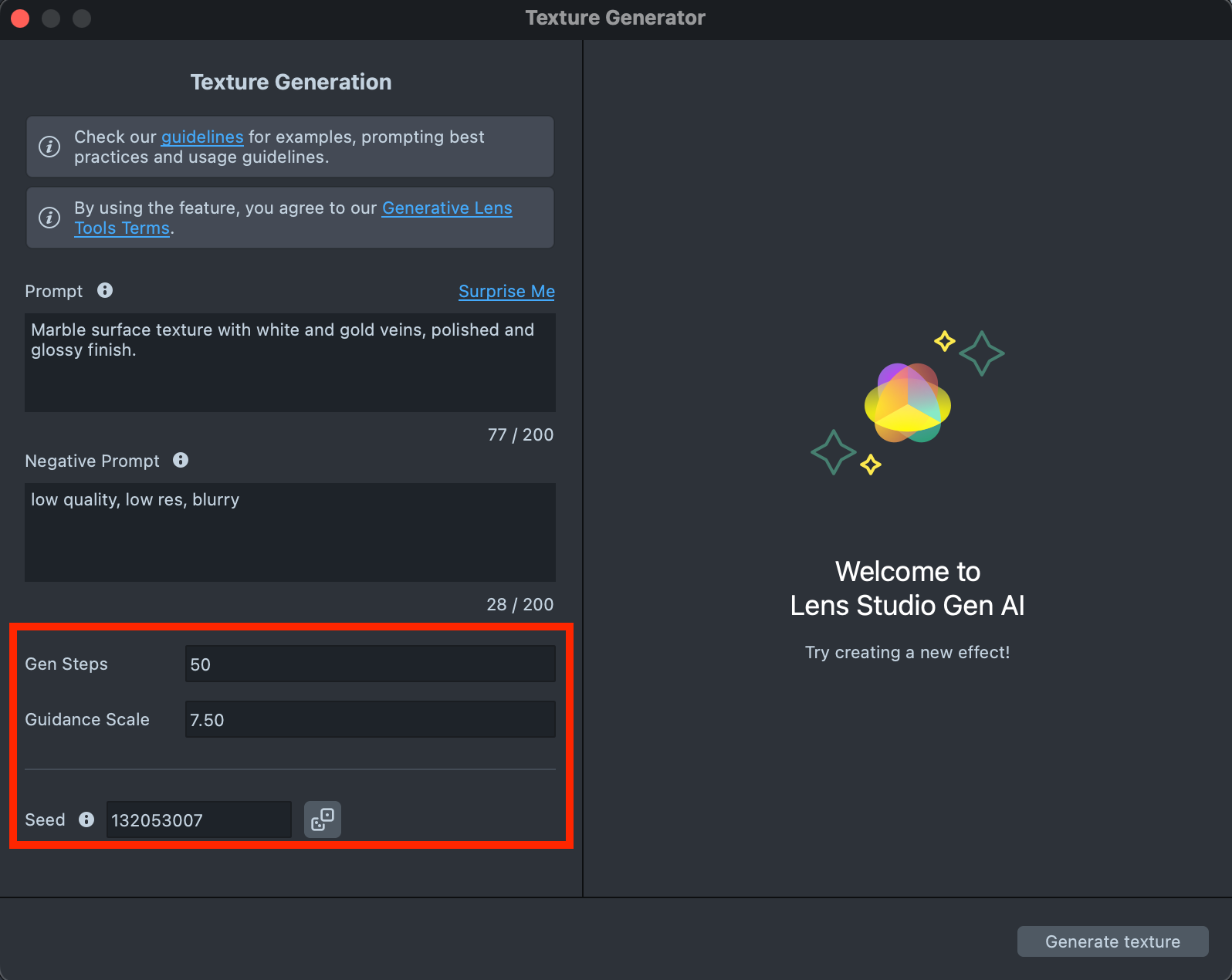 The generated texture will appear in the Asset Browser under the name Texture Generation Result. Once you’ve finished building your Lens, save your project and push the Lens for testing on Snapchat. See the Pairing to Snapchat guide to test your Lens on a device, and the Publishing guide to learn more about sharing your creation.